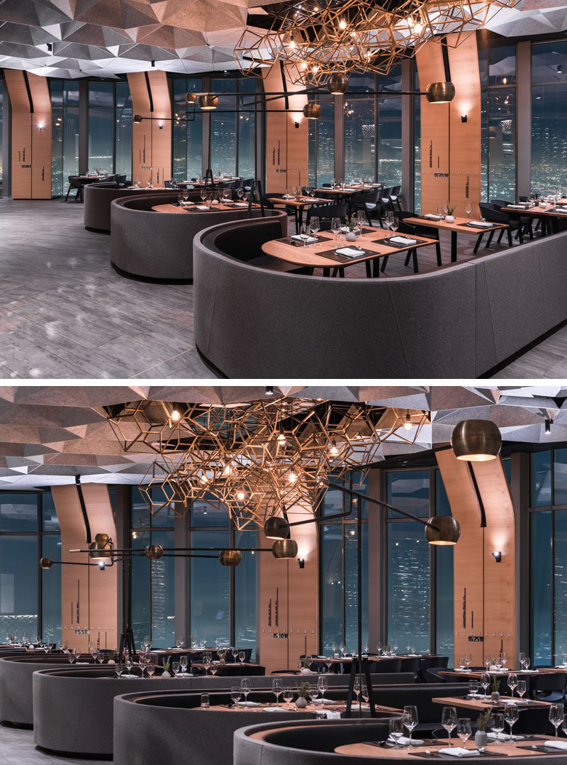 When designing the space the architects had to take into account the amount of sun the restaurant received and the sound levels. In order to make sure the view of the city can be seen at any time during the day, they used a special electrically controlled glass that changes opacity of the windows as the sun moves across the sky, minimizing the heat and glare within the restaurant.