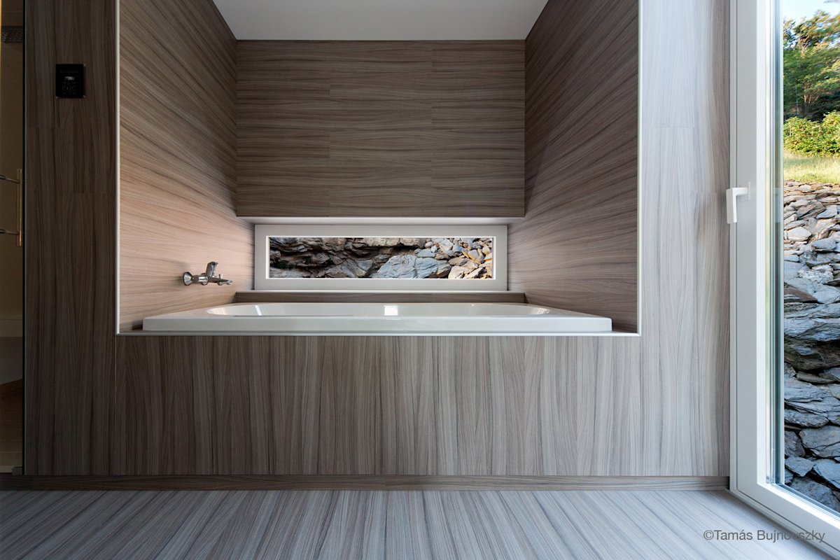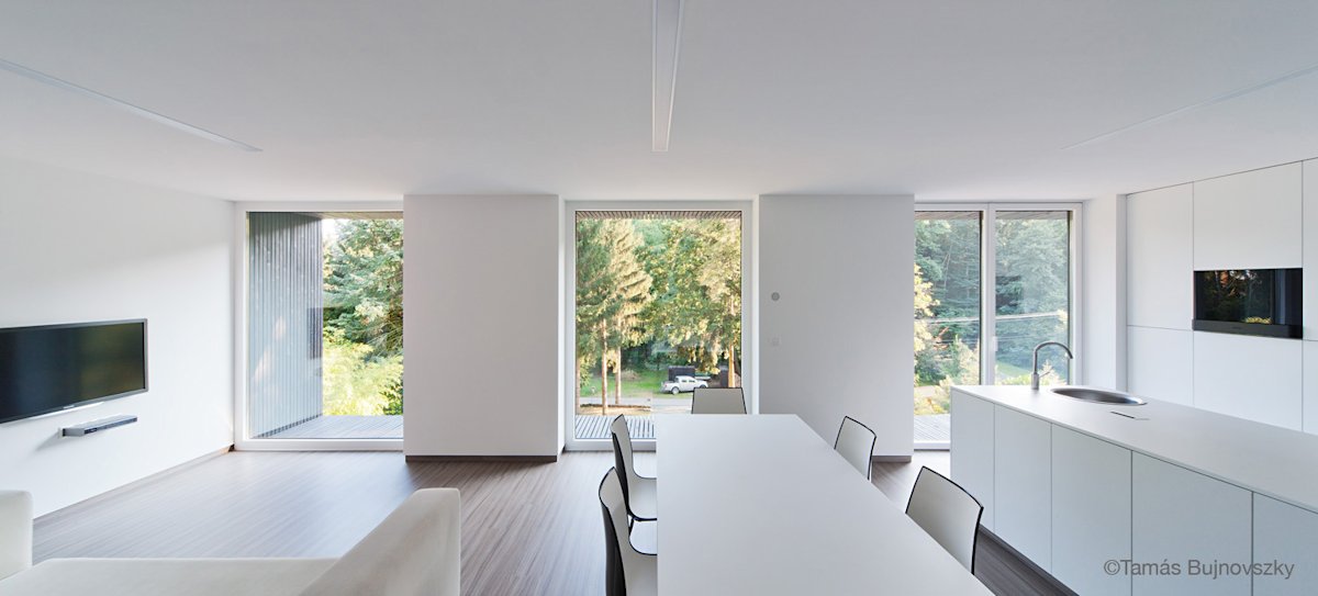 Natural lights and views to the surrounding nature were the most important factors at the arrangement of spaces. The solid and open surfaces of the 110 sqm building react to these elements as well – large but shaded openings towards the best views on the south side, glimpses of the rock from accentuated spots on the north.
