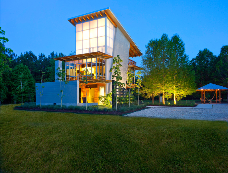 The Pond House at Ten Oaks Farm is a 1,250 square foot, net zero energy retreat located on a 15.5 acre site in Southeast Louisiana. The three-story structure sits over the edge of a pond and overlooks a peninsula of ten oak trees that stretch out into the middle of the pond.