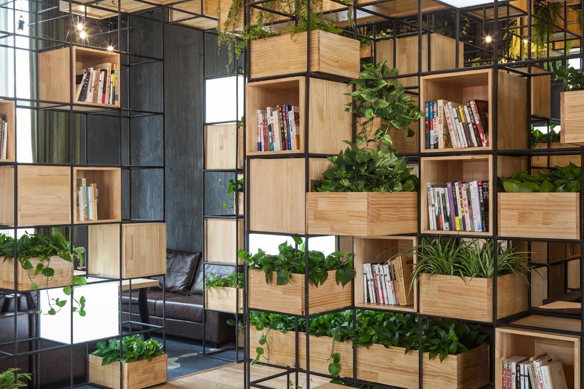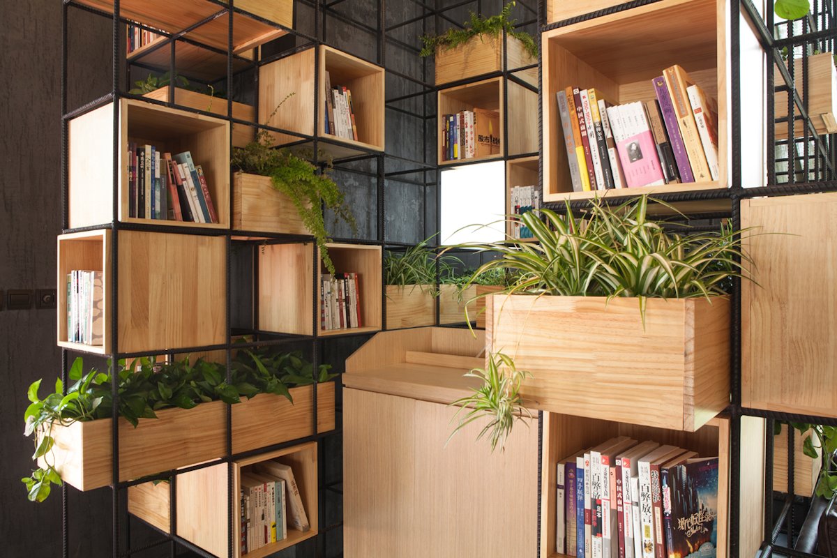Constructed with recycled steel bars, the modular dividers shelving plants, books and lights give Home Café a hybrid of industrial and horticultural touches.