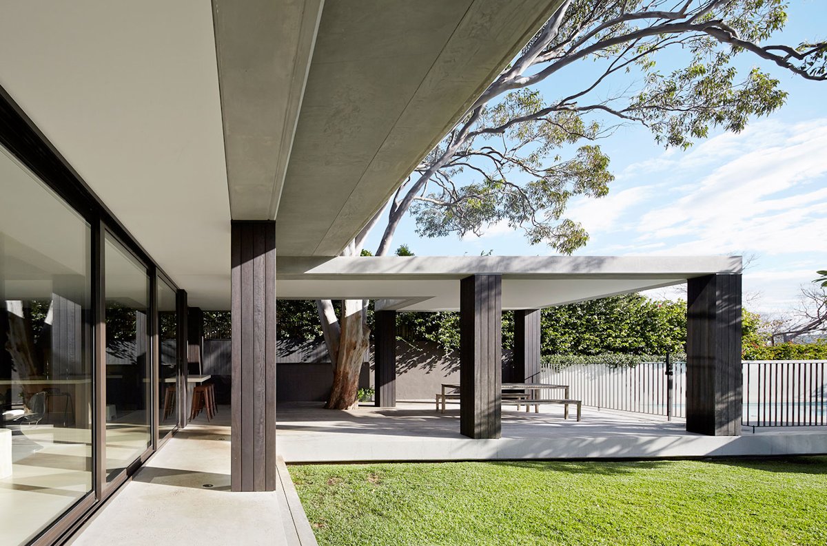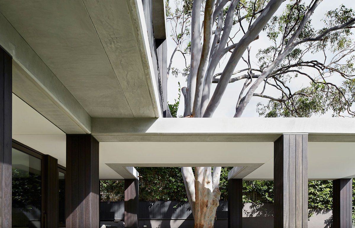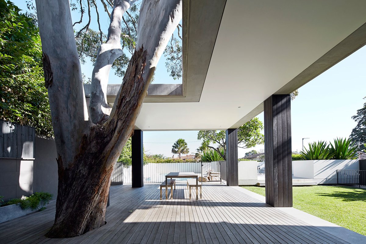 The covered outdoor spaces are literally built around the tree, encapsulating and framing the trunk. The timber-clad columns recede into the background and a fine line of glazing opens to the densely planted side yard for continuous access to the natural environment from within the interior spaces.