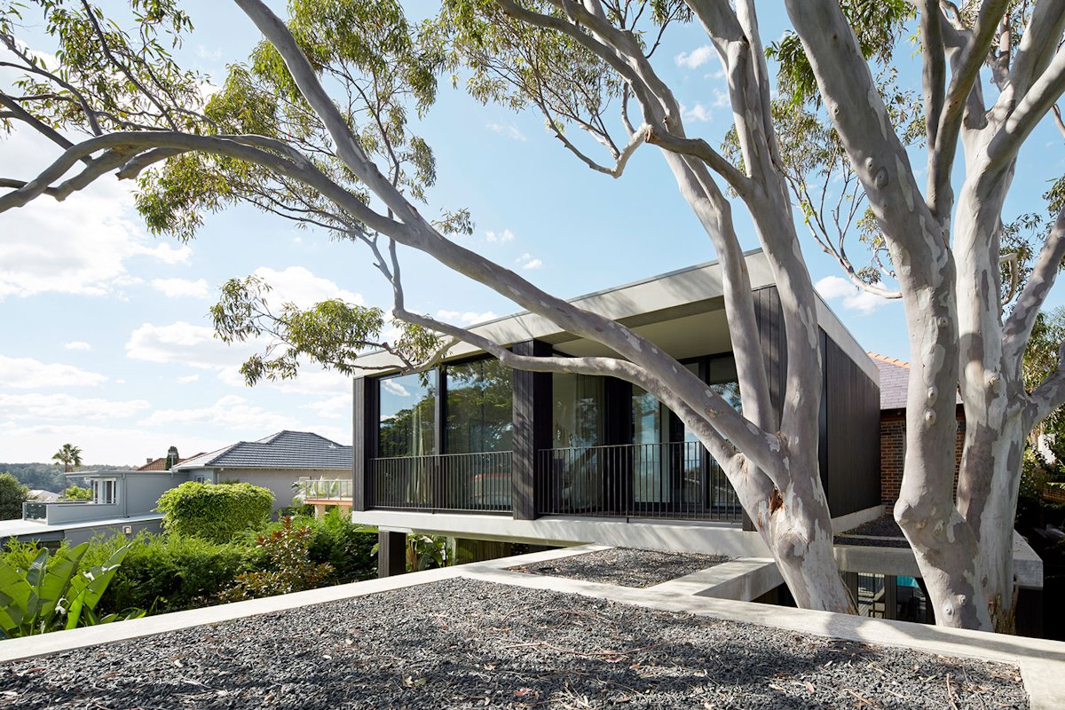 The upper level sits in the branches of the tree floating above the bottom structure to provide a unique treetop setting overlooking views to the Sydney Harbour. The roof is treated in a considered stone so that it is more like landscaping adorned with the scattering of fallen leaves.