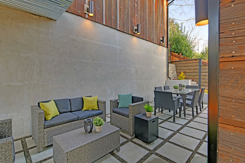 Beside the front door, the house cantilevers out creating a perfect covered patio. Smooth cement pavers ensure it’s easy enough to walk around without shoes.