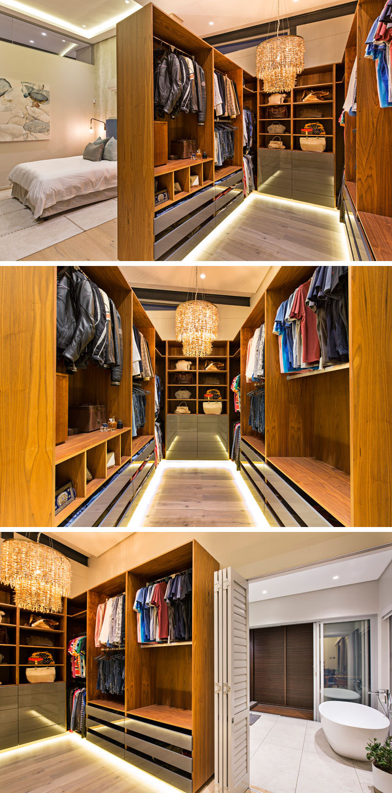 This all wood, modern walk-in closet separates the master bedroom from the ensuite bathroom. A unique textured chandelier centres the closet, while hidden lighting on the floor adds a warm glow.