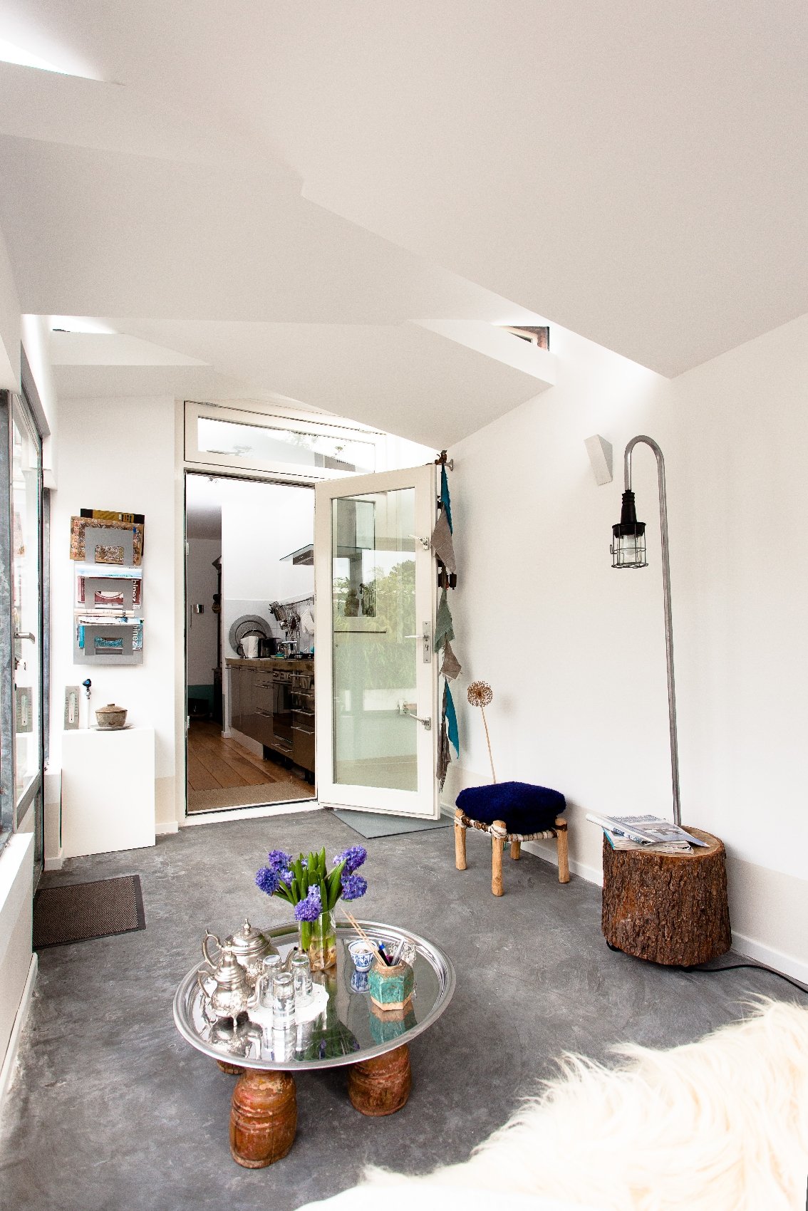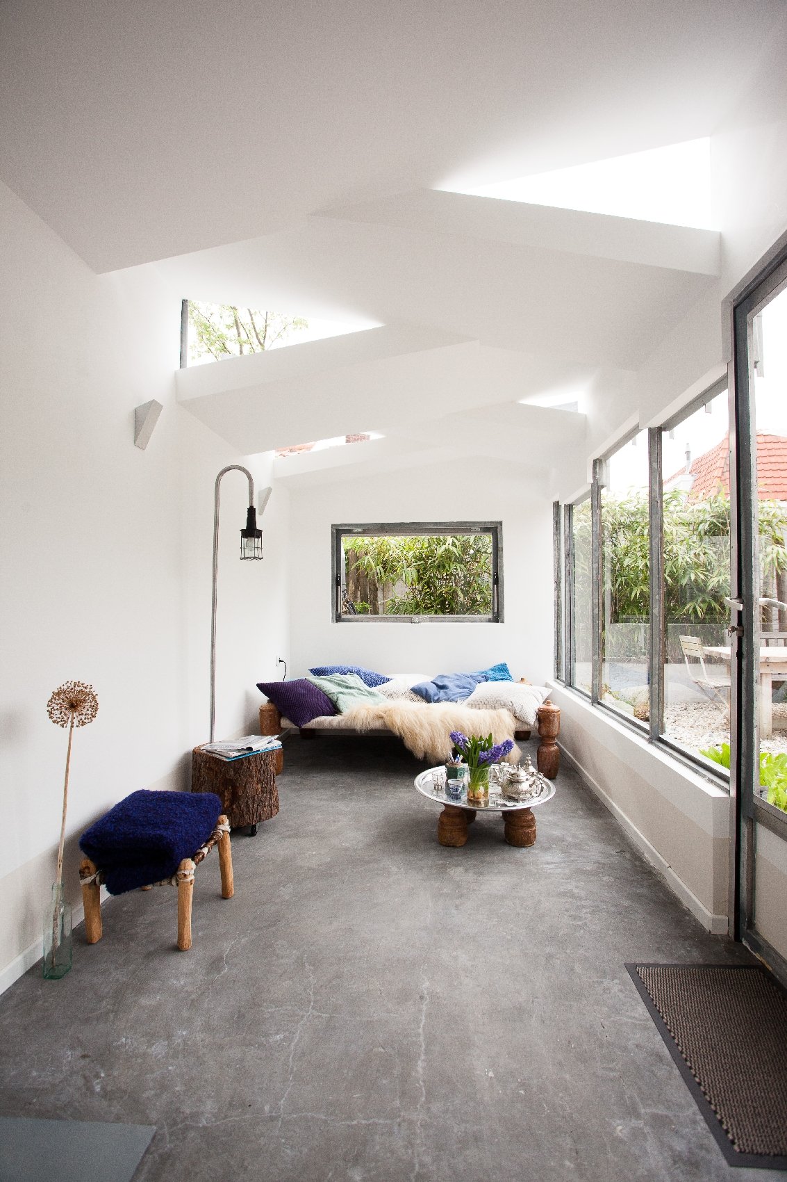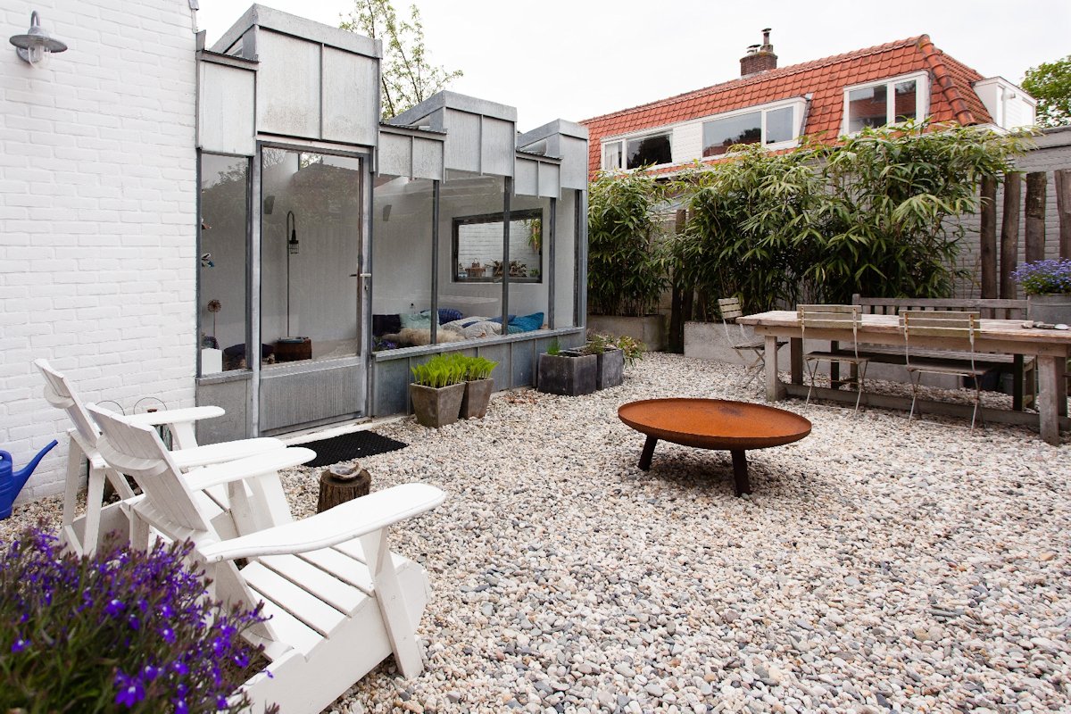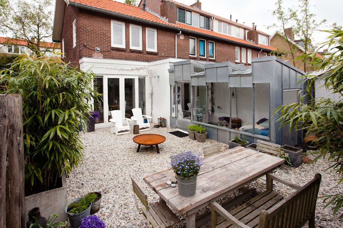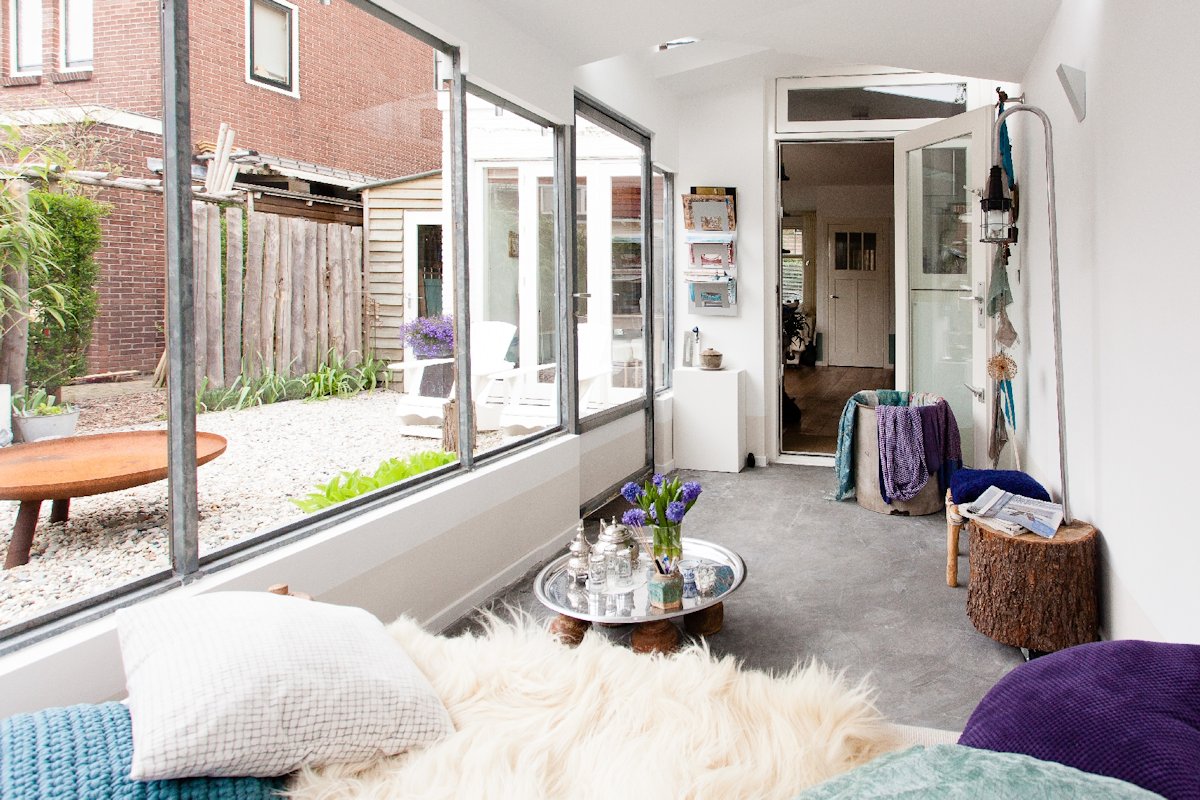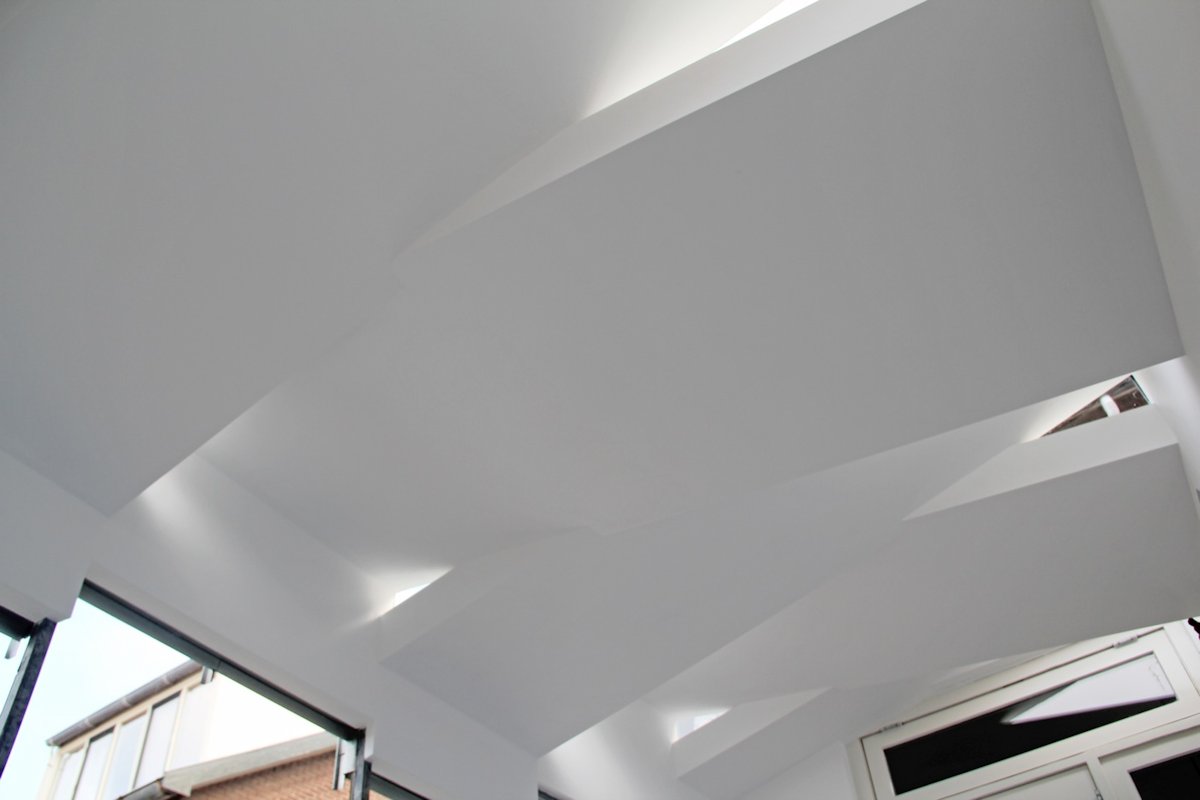 The design is completed with the placement of a unique extension. On the contours of the old extension a lightweight construction realized a healthier relationship with the garden. The volume is divided into segments with opposite slopes, which optically reduce the scale. Between the different slopes, triangular windows are placed. In this way the interior is lit from above is without compromising to intimacy.