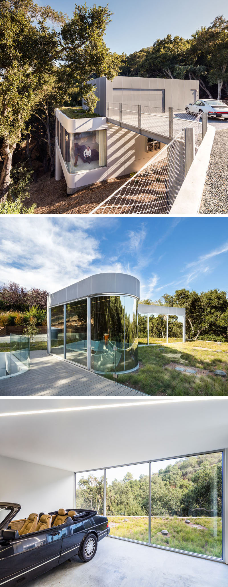 A bridge of steel grating connects the drive to the rooftop that features native grasses, while an observation deck sits in the grass field along with a garage/foyer of zinc panels and mirror glass.