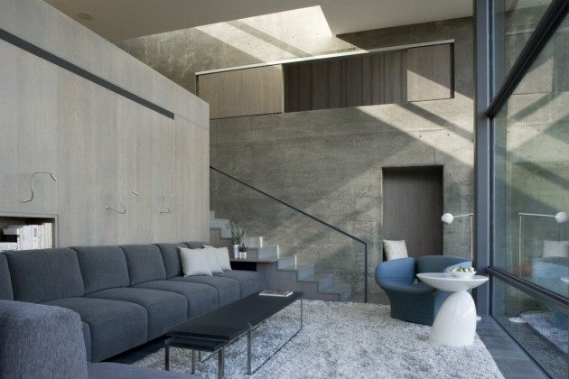 At once grand and intimate, openings between levels allow for conversation and unexpected views from place to place – it is a fun place to explore and live, a precisely crafted structure in a rustic landscape. The house is organized on three levels descending with the hill with a 30-foot high concrete wall skewering the plan acting as a visual and structural anchor. Entering from the south to an entry level is a bedroom/bath. The mezzanine level has a kitchen and eating area, and on the lower level there is a living room. Floors/steps/wall tile are a soft grey limestone. All the woodwork is oak, stained grey with inserts of clear acrylic resin. Steel is used for all the exposed structure and mullions and the countertops a grey eco-composite. The central concrete wall is delineated with a series of openings and recesses so that sliding panels and doors lay flush or a small niche is available for sitting off of the main living room.