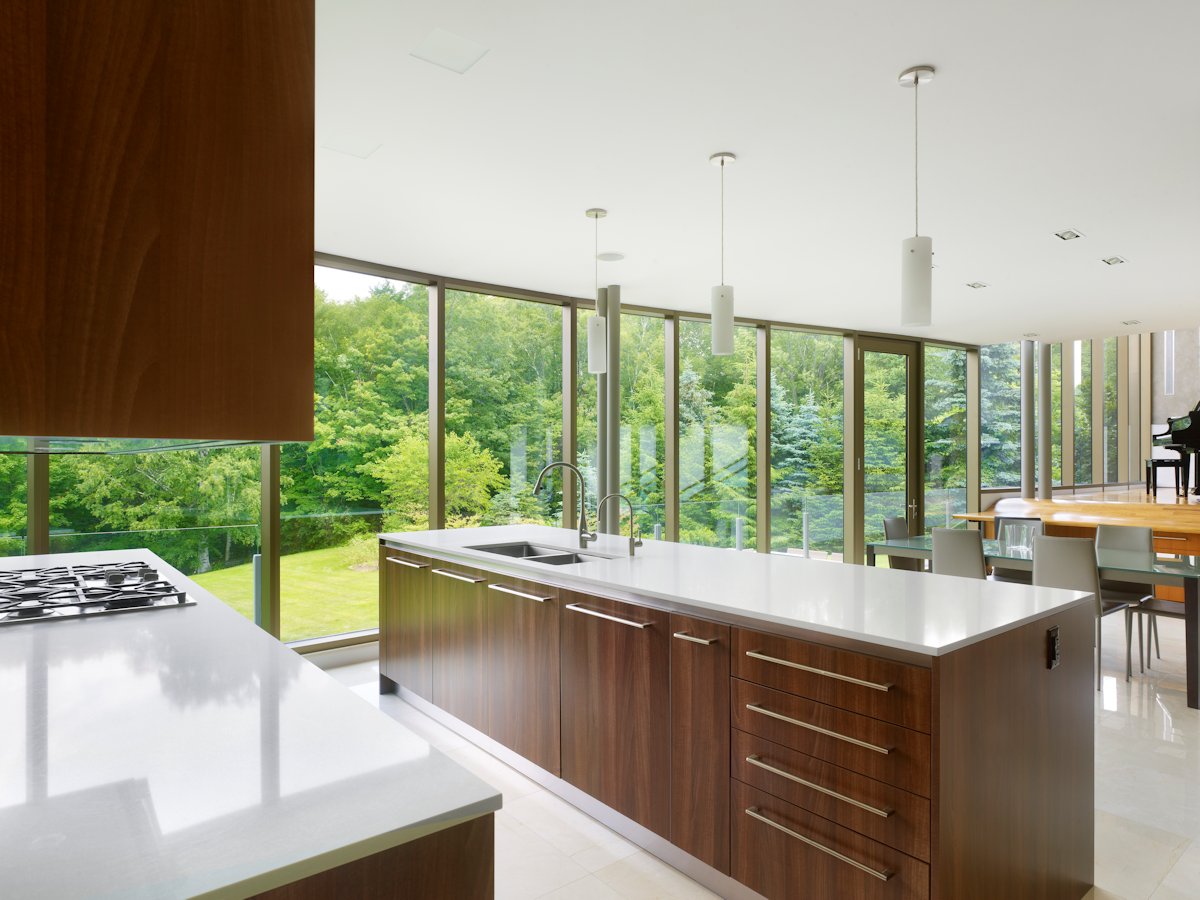 The materials, chosen for their natural properties and ability to endure the regional climate, reinforce the ethereal quality of the home. The front façade is clad in triple layered slate supported by stainless steel clips (system to last 100 years), complimented by wood framed windows. The unblemished white interiors create fields to catch light. Marble, stone, glass and wood finishes add warmth and provide a neutral stage from which to view the changing seasonal colours.