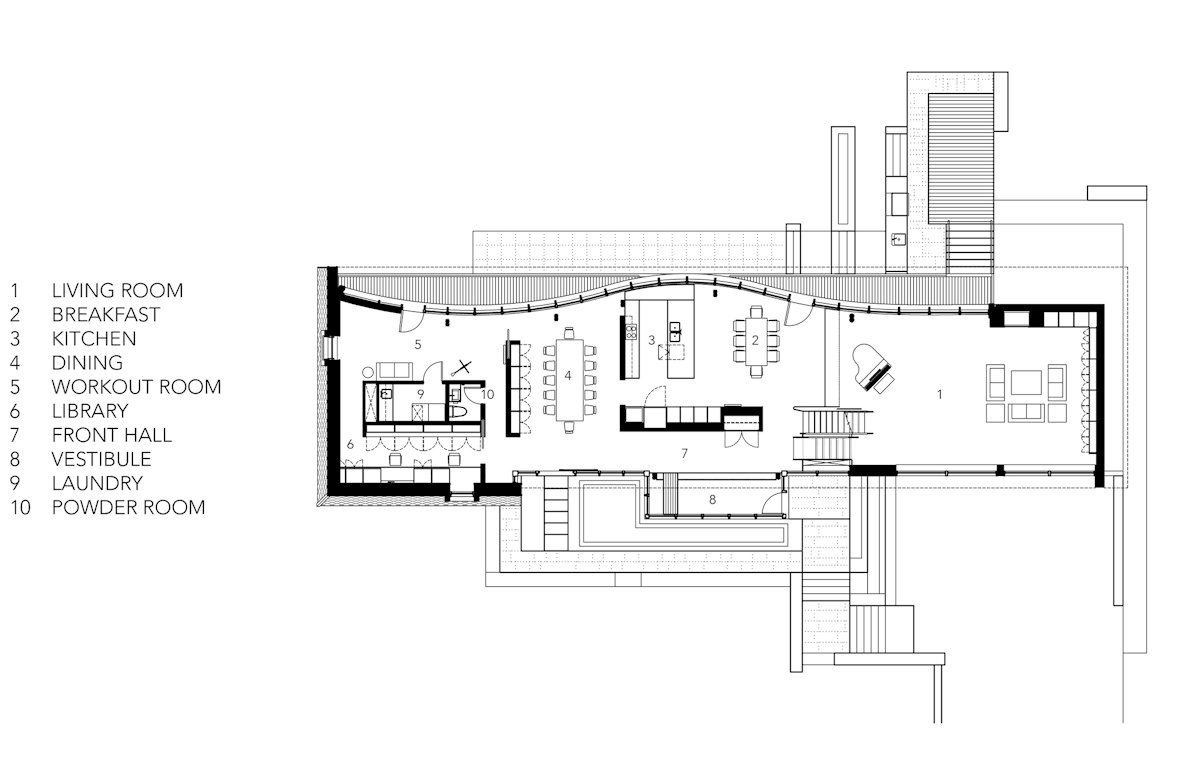 The distinctive facades of the imaginative form poetically and functionally respond to the scenery in the front and back. Stepped landscaping naturally connects the driveway to the bold sloping front façade and creates a gentle transition between the home and the 2.3-acre property. In contrast to the privacy provided by the front façade, the glazed and undulating rear façade opens the home to a mature forest. The lower level takes advantage of the sloped yard to provide a direct walkout to the ravine.