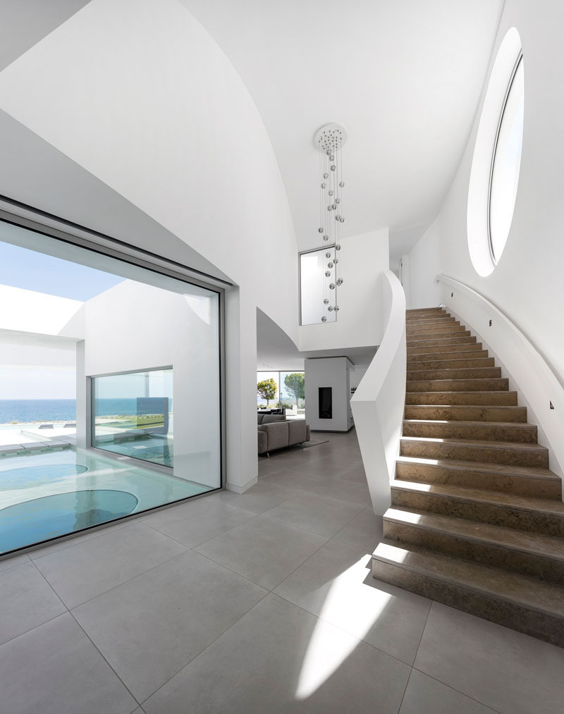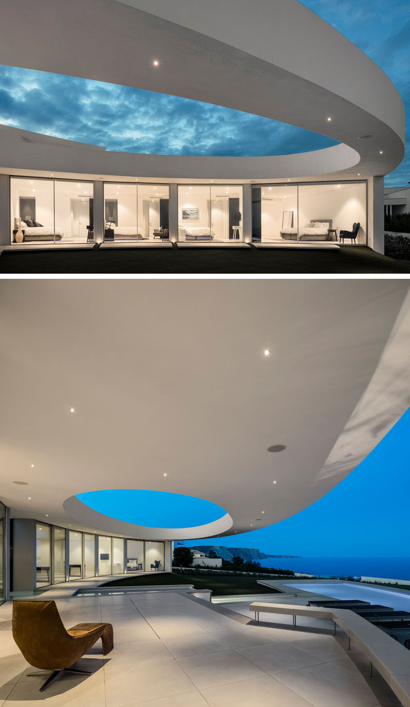 On the top level of the home, there’s an additional bedroom and access to the top of the ellipse. From this angle you can see that the house has uninterrupted views of the sea.