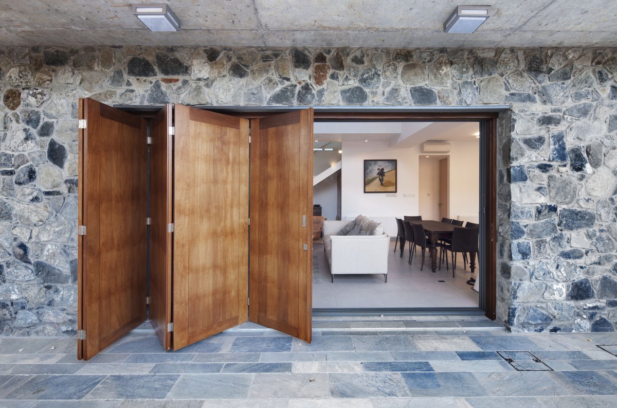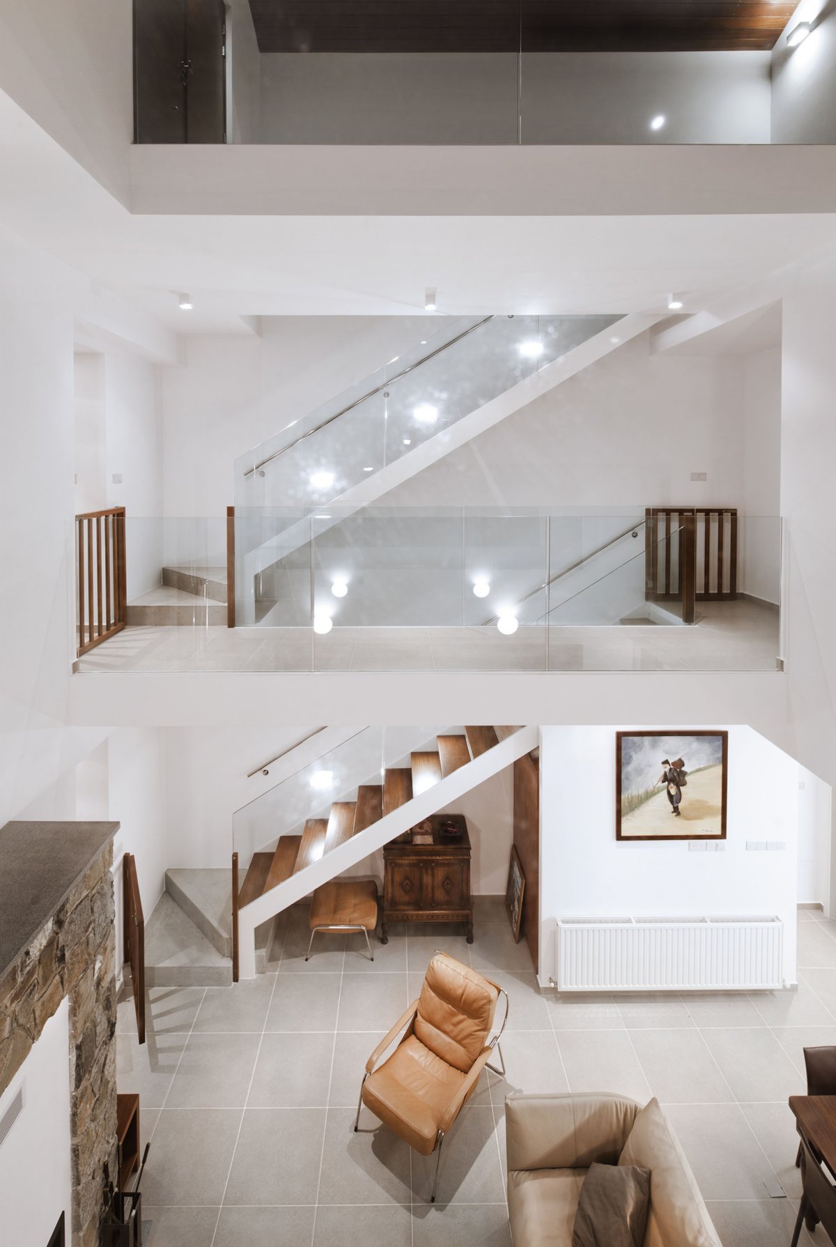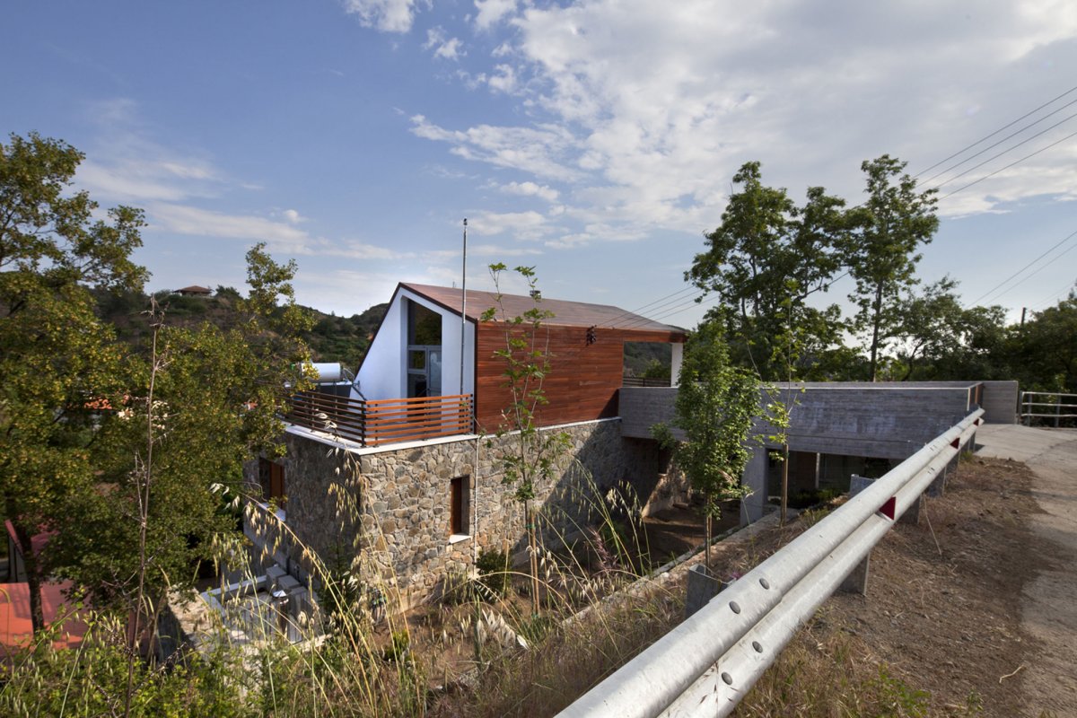 House is located on a very dramatic hill in ethnical village of Cyprus. The facades and the roof of this house comprise one entity. The skin, consisting of Irokko wood cladding, is open in strategic places in order to let the environment in – “window to nature”. Maximizing this effect and functional arrangement the entry of the house is placed from the top of the hill. The exterior looks rather solid and enclosed using very traditional materials and details: local stone, wood, shutters. Though the main interior vertical axis – void creates continues emotional experience through all the house bringing the light in each floor.