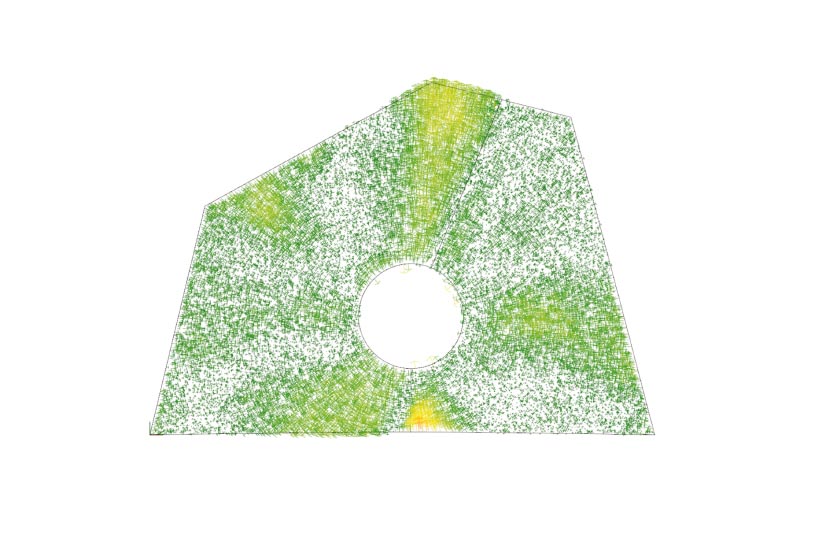 The travelling pavilion’s modular wooden skin is designed and produced utilizing the self-forming capacity of initially planar plywood sheets to form conical surfaces based on the material’s elastic behavior. Within the deep, concave surface of each robotically fabricated module a weather-responsive aperture is placed. Materially programming the humidity-responisve behaviour of these apertures opens up the possibility for a strikingly simple yet truly ecologically embedded architecture in constant feedback and interaction with its surrounding environment. The responsive wood-composite skin adjusts the porosity of the pavilion in direct response to changes in ambient relative humidity. These climatic changes – which form part of our everyday live but usually escape our conscious perception – trigger the silent, material-innate movement of the wooden skin. This subtle yet constant modulation of the relationship between the pavilion’s exterior and interior provides for a unique convergence of environmental and spatial experiences.