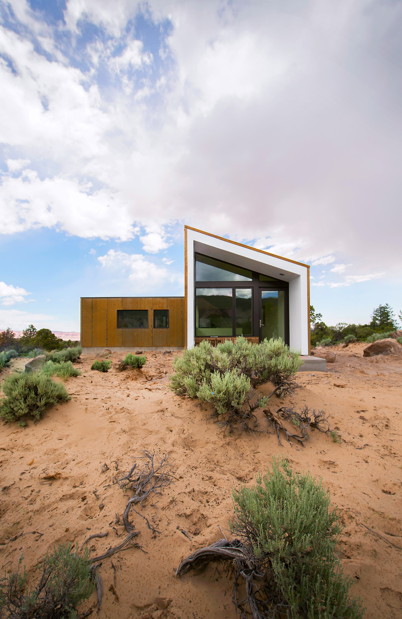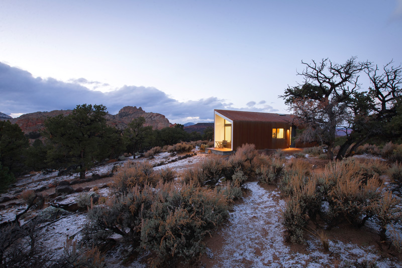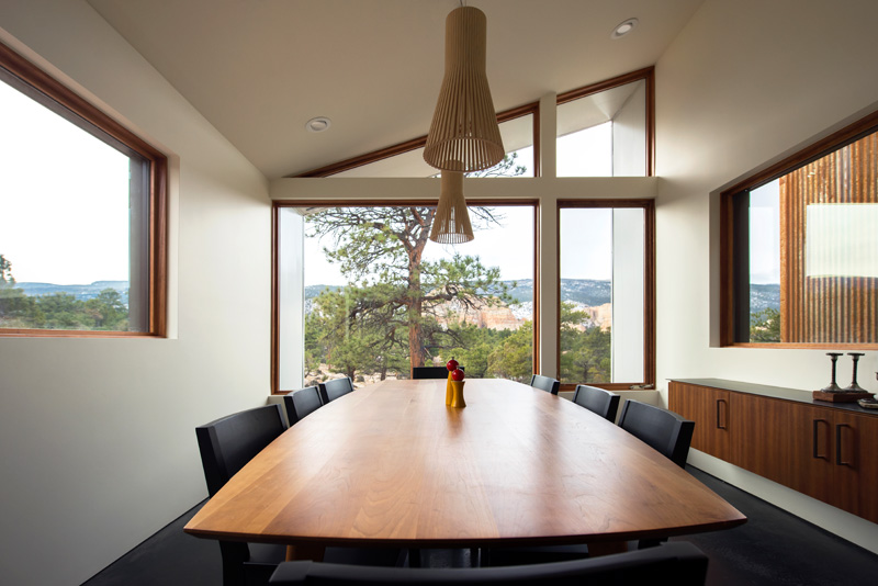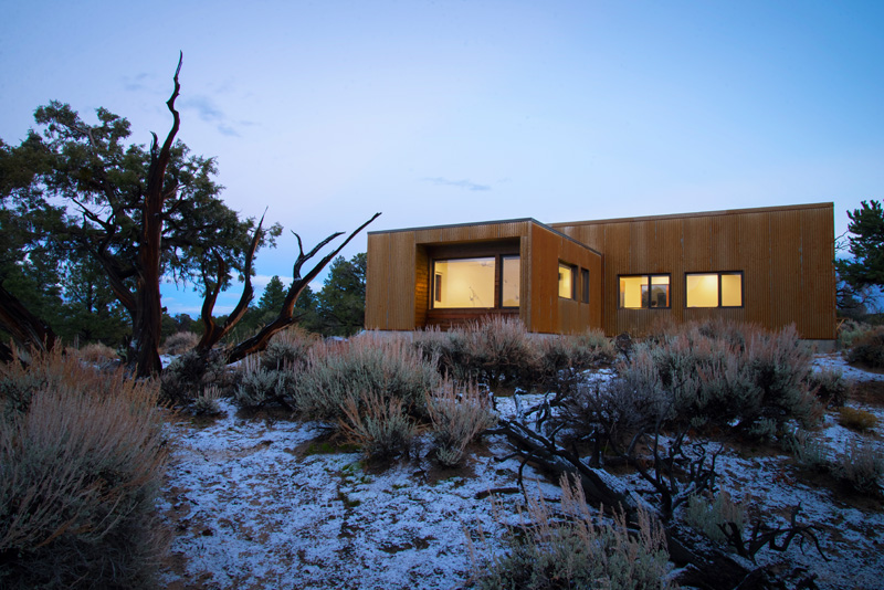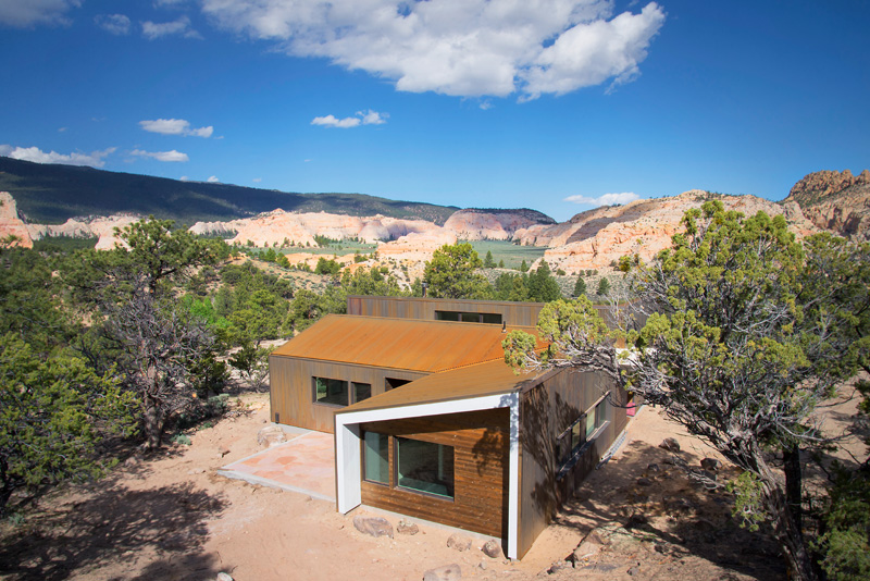Reflecting the red rock megaliths that protrude out of the horizontal landscape, the sharp lines of the house rise above a shroud of vegetation to stand in contrast to ancient, twisted juniper trees. Like the native rock and trees, corrugated Corten panels and cedar siding naturally age to a self-protective patina baked on by the arid heat and desert sun.