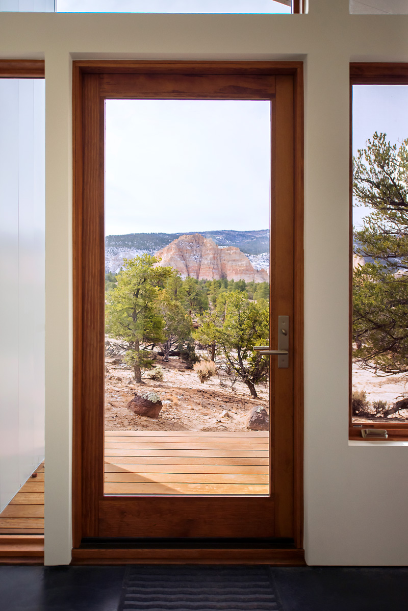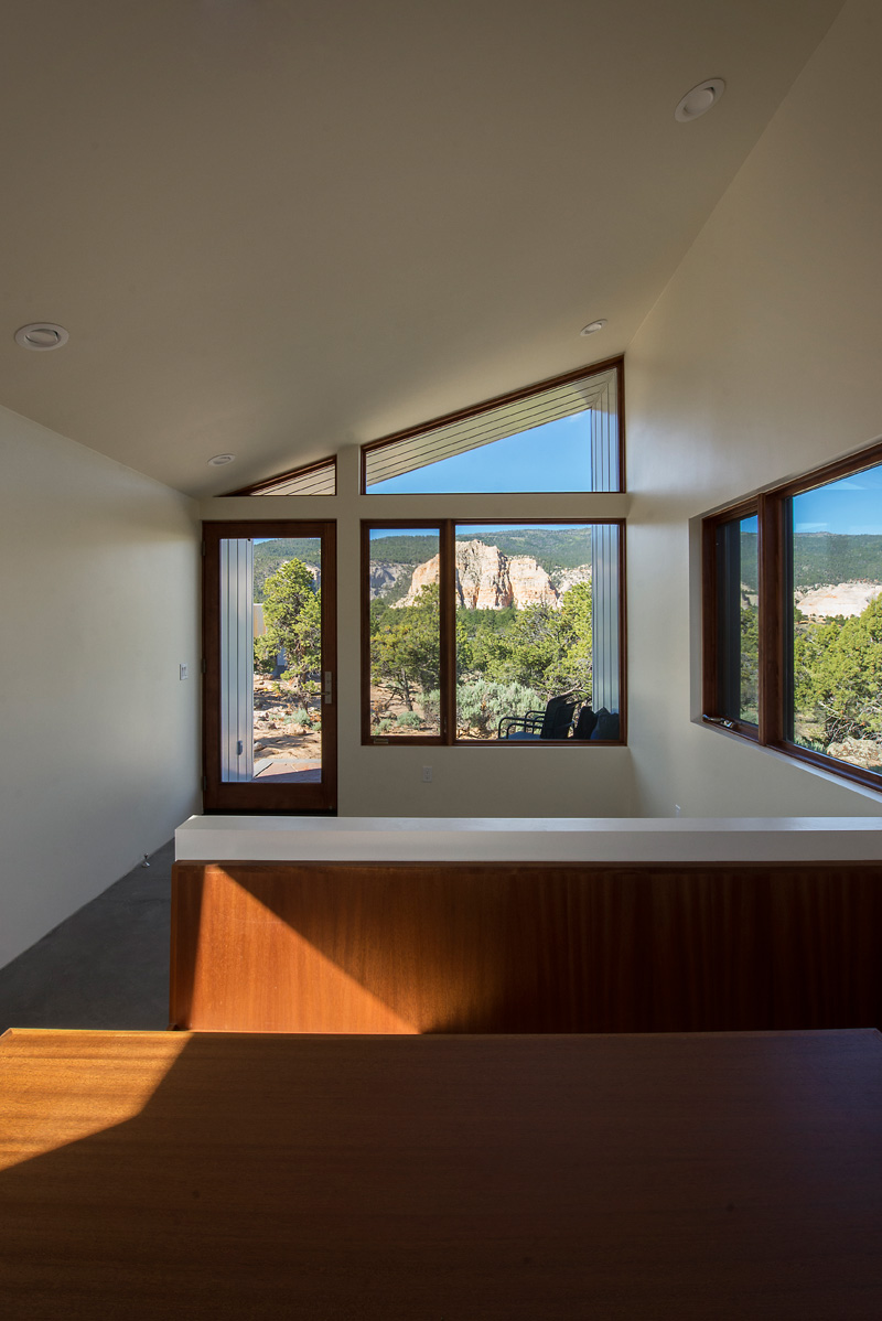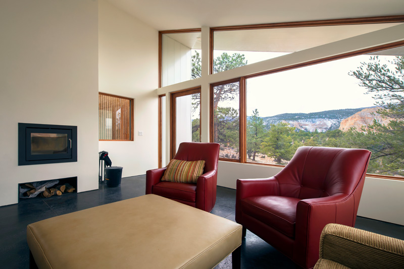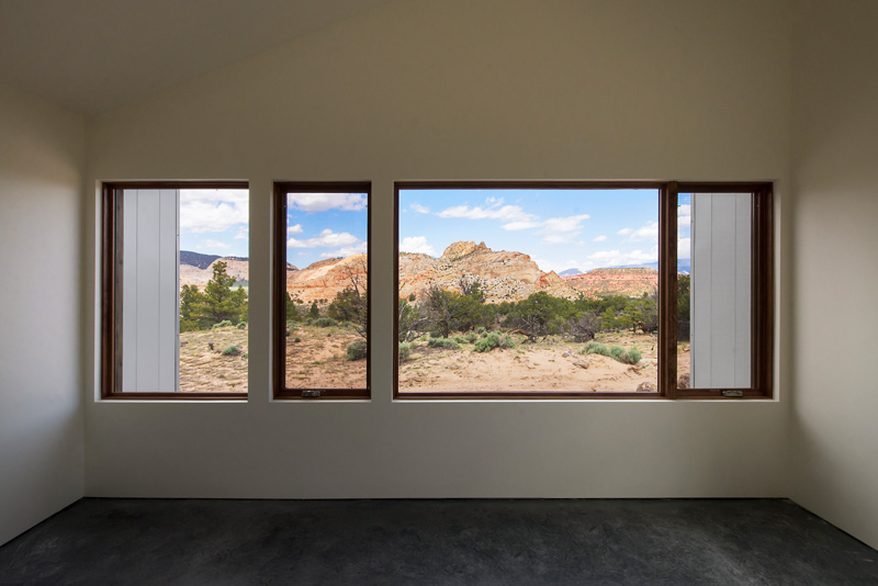 The solution came by way of multiple shed roof forms extruded along ‘L’ shaped paths. The volumes ends are open in expansive glass walls to highlight views of the specified formations, while horizontal windows along the lengths of the volumes frame panoramic views of everything between.