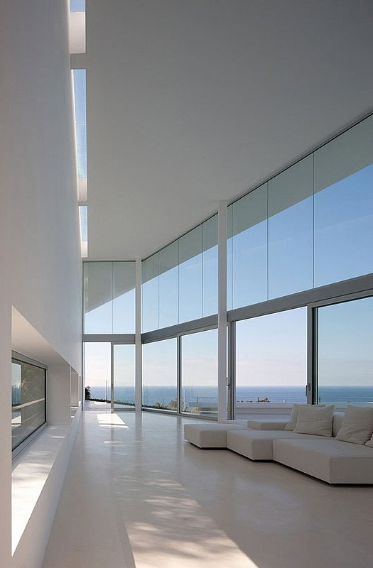 The house takes up its position, back facing the other houses, and simply embraces the entire horizon. The architect has limited terrain to work on. The trick however is to release all the emotions of the place: opening or splitting, reflecting infinity.