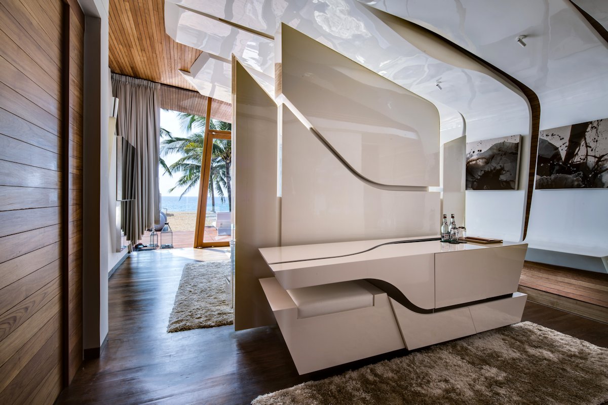 Both rooms designed by A-cero are on the seafront. Two shell shape bungalows sharing an exterior swimming pool. Both elements play with each other and we tried to achieve the opposite interior design between them. In the first room, the vertical lines flow introducing into the sight of the visitor. In the second room the curved lines move horizontally embracing the space around. It is a game of vertical and horizontal lines that wrap the space. Looking for the “ying & yang” and different sensations for each other. The furniture of the rooms is born in each of the curved lines that create the rooms. The natural local wood is used for the floors and the walls of the rooms, looking for a natural environment according to the exuberant surroundings. In each of these rooms we have changed the disposition of the elements to make them different. The first room has light wood horizontal sense floor and dark wood ceiling. The second room is the opposite, with dark wood vertical sense floor and light wood ceiling.