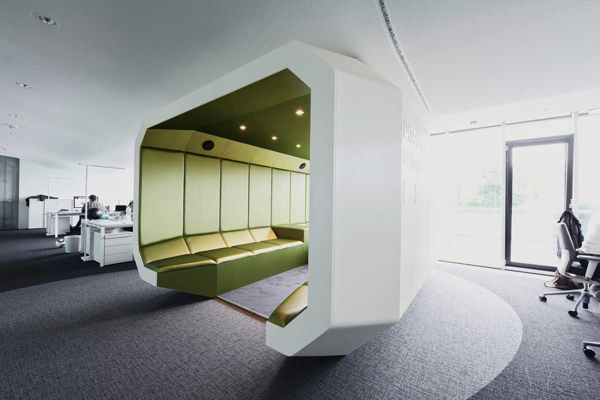Dynamism and movement are key features of the design, which assimilates employees and visitors the second they enter the spacious reception hall. These design elements guide you through the open work zones and the specially created employee library right up to the in-house gym on the fifth floor, which offers an amazing view over Frankfurt. Polygonal spatial elements and a wide range of materials represent the high design standards of the agency itself. Open and transparent work areas, paired with semi-public and completely discreet conference zones promote a creative and communicative working atmosphere.