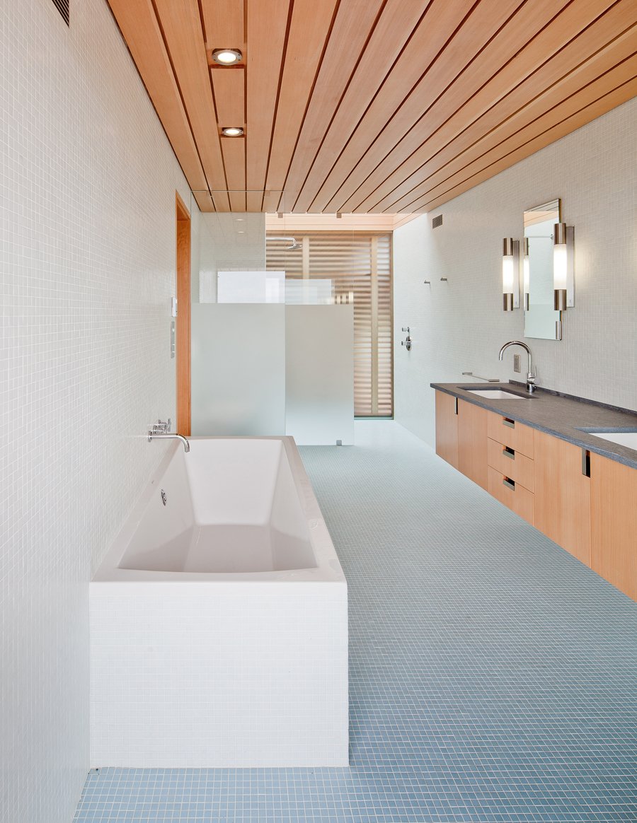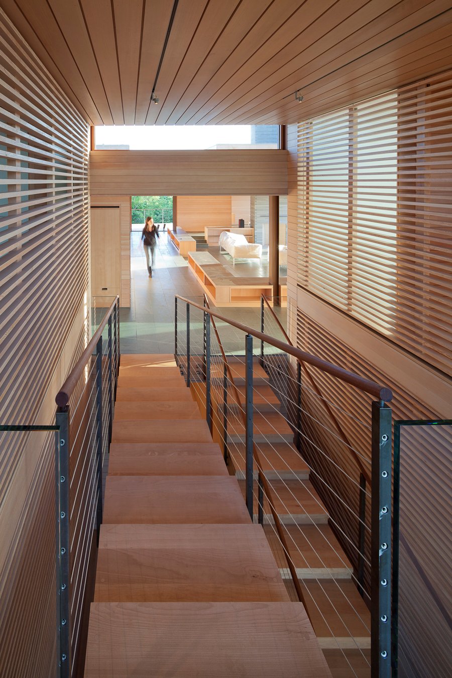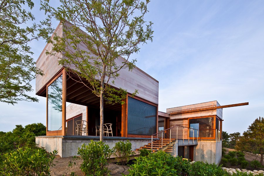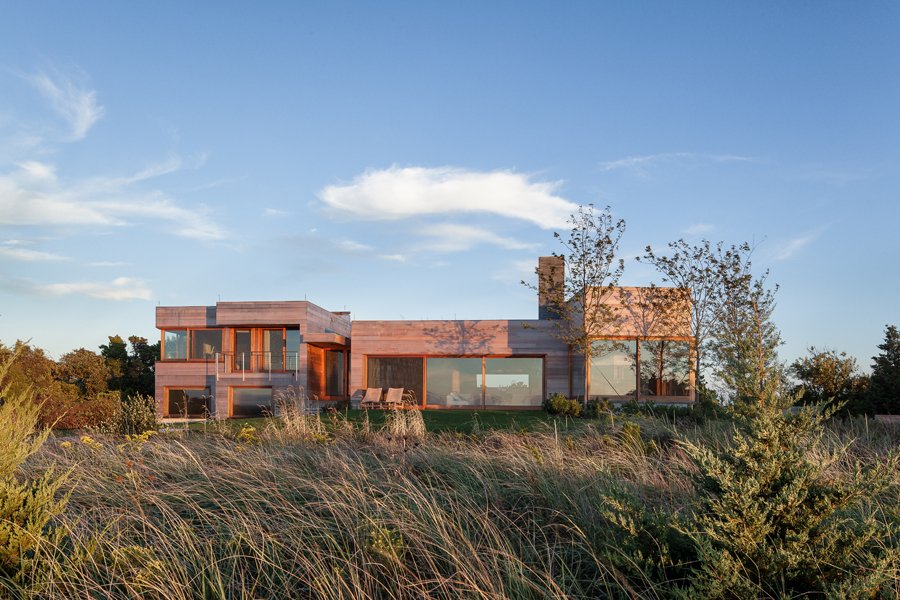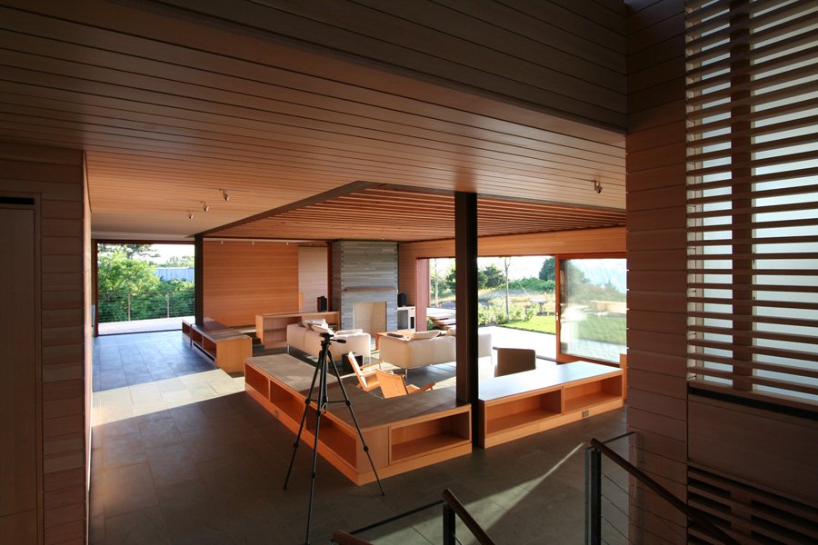 To minimize the environmental impact of the new construction, the house deploys a suite of sustainability strategies that not only conserve energy, reduce waste, and save money, but also promotes intimate encounters between the house’s guests and its surroundings. The structure’s unassuming cedar-clad façade belies a sophisticated building envelope, which utilizes rigid insulation and other strategies to withstand the hardiest of nor’easters. Where the façade lacks wood, it contains fully operable glass windows, created by a local craftsman who has developed a technique which allows corner windows to open completely, and large panels of glass to slide open along the exterior façade of the building, leaving nothing but the view and the ocean breezes. Strategically placed to encourage natural ventilation, these calibrated window openings work in concert with the structure’s radiant heating and cooling to modulate the residence’s living spaces and vastly reduce the size and operating cost of HVAC equipment. The residence’s southern exposure floods the interior with natural light, maximizing solar heat gain and minimizing electrical consumption, while green roofs – covered in natural sea grasses – provide greater thermal performance and roof insulation, improve air quality and biodiversity, manage rainwater, and reduce noise. The landscape was likewise considered in terms of sustainability using local species, and an irrigation system that uses water collected on green roofs and stored in a large cistern.
