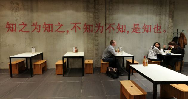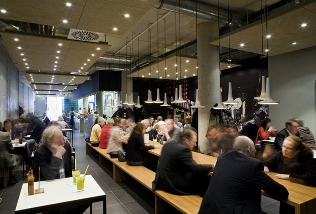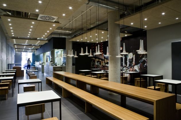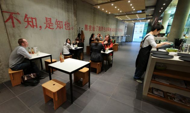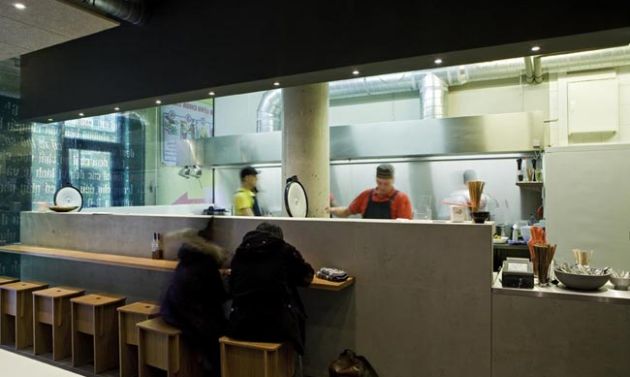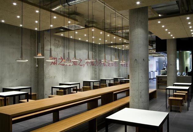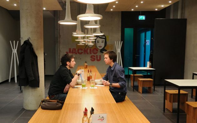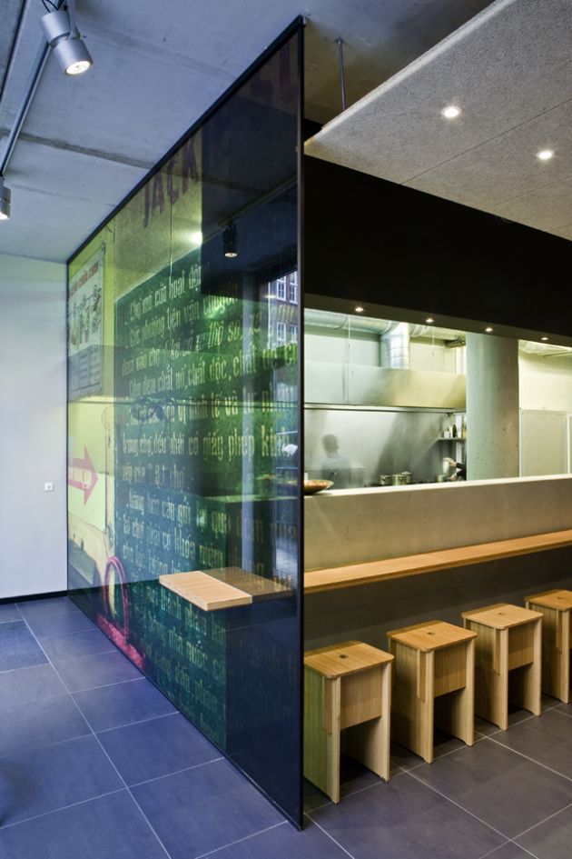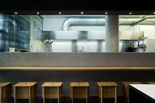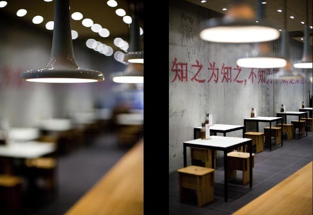 “Urban street Kitchen” is the motto of the small restaurant in Bremen’s city centre. We transported the asian street kitchen character into a contemporary and clear interior architecture. High fair-faced concrete walls with the artwork presenting a smiling Jackie Su, bright red Asian characters as well as the large suspended acoustic ceilings and unclad air-conditioning ducts emphasise the urban ambience.