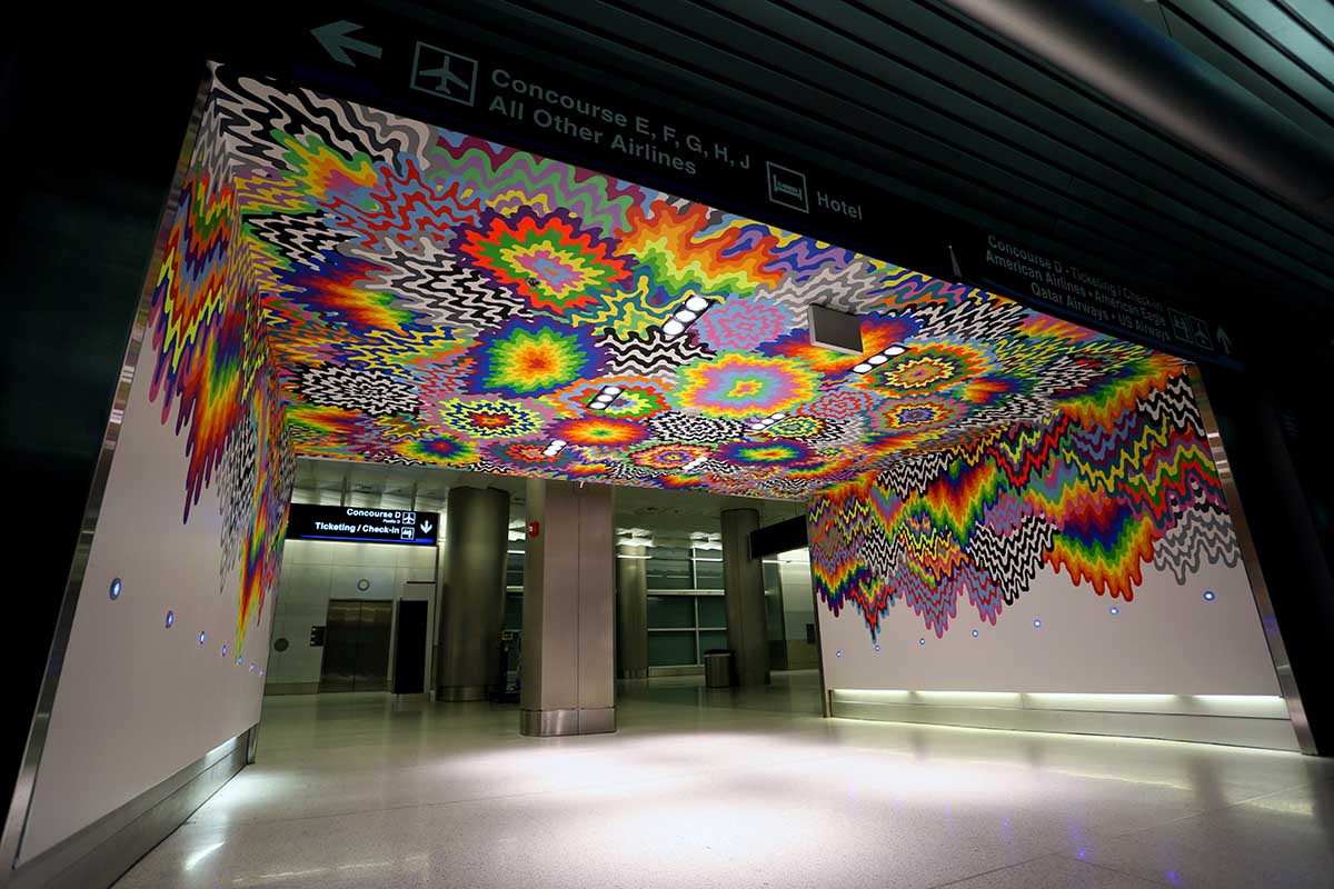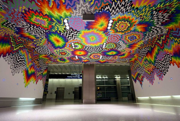 Artist Jen Stark has created Meltdown, a permanent installation inside the Miami International Airport. You can find the between Terminal D&E on the 3rd level, just off the moving skywalk.