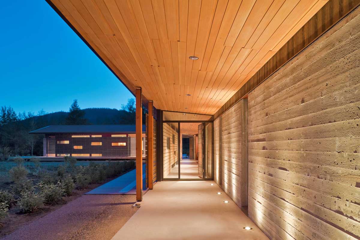 The long drive opens onto the intimate entry court. A concrete wall which extends into the landscape marks the entrance and defines the major circulation spine of the house. Public spaces open off this axis toward the views to the mountains. Secondary spaces branch off to the north and south forming the private wing of the main house and the guest cabin respectively. With regulation restricting the roof forms, the structural trusses are shaped to lift the ceiling planes toward light and the views of the landscape. The placement of the buildings, as well as their enclosure, one’s perception of interior space extends to the exterior and the landscape, blurring the distinction between the two.