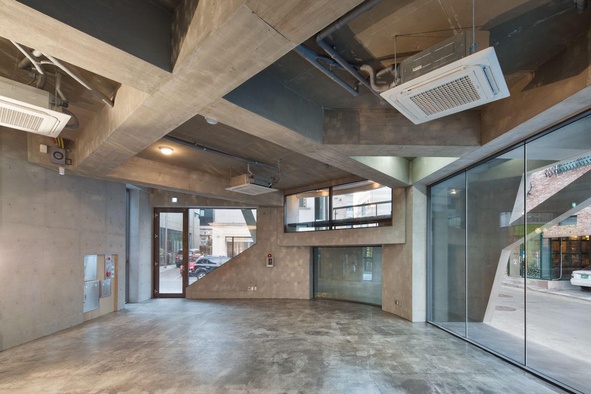 Baekhyeon-dong is divided in almost equal parts by its main café street. The buildings in the surrounding areas are similarly subdivided by their function; the lower and ground levels are commercial, and the first and second levels are typically residential. Amidst this sea of homogeneity, these structures engage in a quiet struggle for distinction, through the variation of form and materials, Of these, the building at street address number 582 is a music agency owned by an IT company. Sitting at a fortuitous corner, it serves as a rare contrast to the numerous other constructions in Baekhyeon-dong that fail to make the most of their locations.