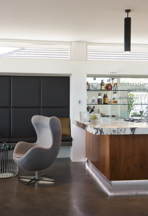 Given the clients’ penchant for entertaining, an additional floor was added which takes advantage of the expansive Sydney Harbour views. Conceived as a “New York style” lounge bar, it features luxurious finishes and bespoke joinery items like integrated leather bench seating and a marble-clad bar area. Another key intervention was the inclusion of a double volume entrance zone which creates a visual connection between the entry level and the upper floor as well as the opportunity for the clients to welcome their arriving guests from the top floor.