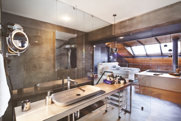 – All through out the mezzanine, the surfaces were covered with a cement-based material, uninterrupted, for a pleasant feeling for the naked feet. This surface created the floor all around, including the shower and also the block, which nestles the bed and the bathtub.
