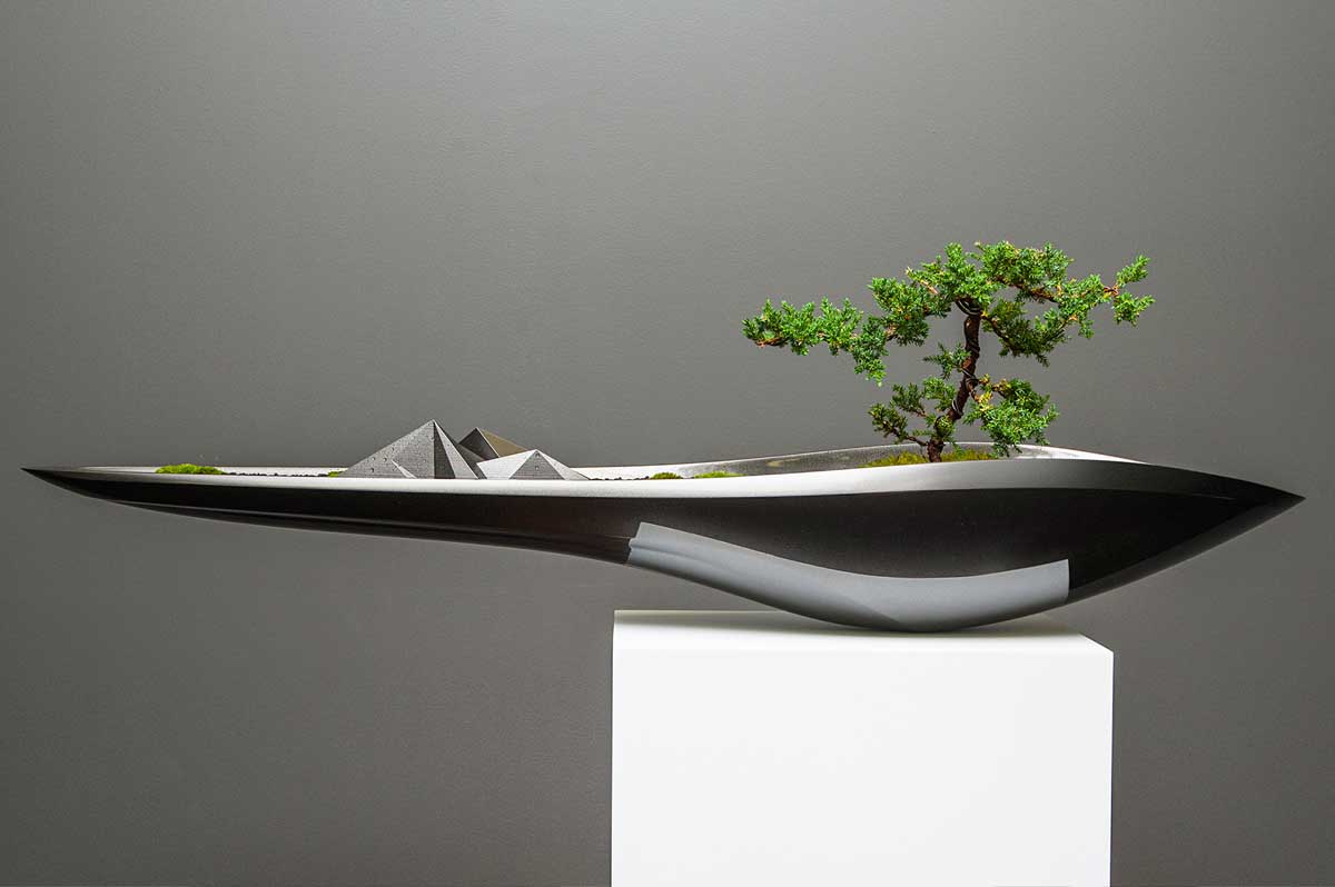 The piece gives the impression of an accelerating form that effortlessly floats to house a bonsai tree, evoking a perfect balance of dynamic harmony.