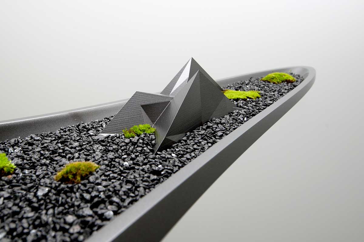 The latest manufacturing processes of the highly polished finishes of the planter and 3D-printed ‘mountains’ contrast to that of nature that usually takes many decades to grow, sculpt and form the gnarled bonsai forms.