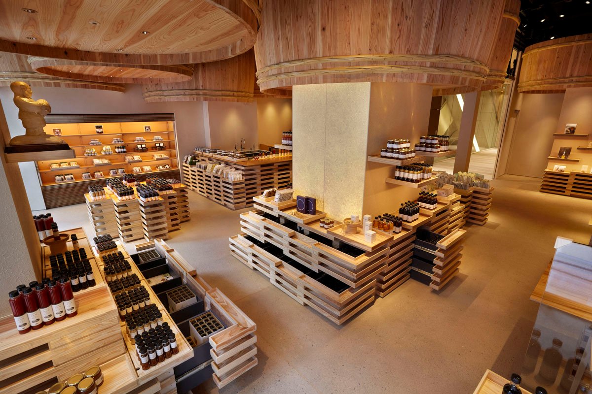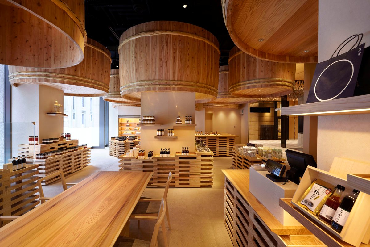Shoyu wooden barrels float to the top. Barrels used for traditional shoyu-making are big and strong. To display the products, Koji Buta (koji is malt rice used as a medium to make fermented food or seasoning as shoyu, miso and sake) is used as furniture. Koji Buta is a special wooden tray when making Koji for shoyu, and its design is highly functional and sophisticated. We wanted to bring in an impact that these powerful utensils suddenly emerge in the town of Nihonbashi, Tokyo.