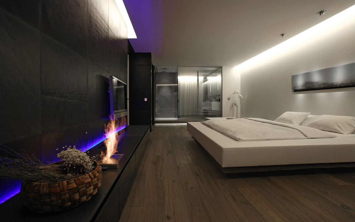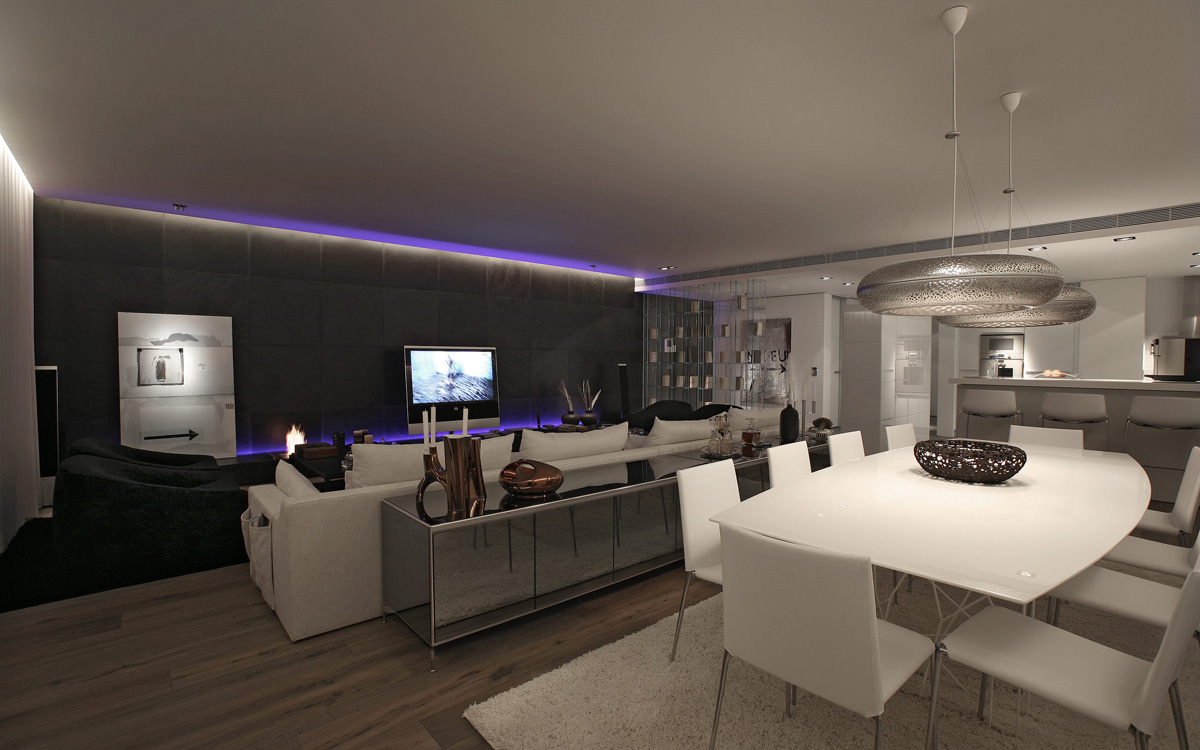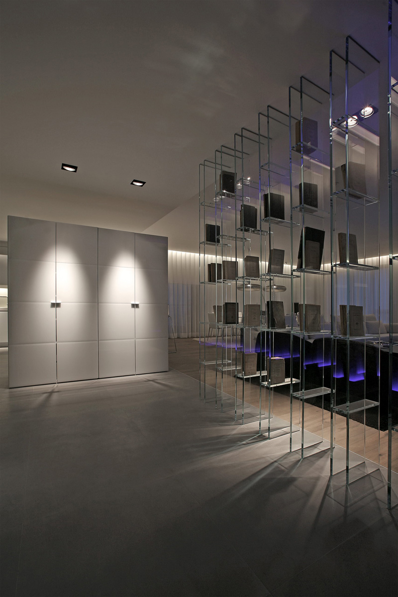 The apartment is designed to feature one living room, an open kitchen, one bedroom with walk-in closet and en-suite bathroom, two guest bedrooms and two bathrooms. The coat rack, which is not included in the current plan, is located right opposite the entrance as a free standing object. On the right hand side of the entrance is placed a glass bookshelf with old books. This is also used as a separation between spaces and is reflecting the main concept of this project. The transparency of the material, the modern form and the elegant looks contrast with the traditional and classic appearance created by the old books, defining the main atmosphere of the house. The kitchen, which in the original plan was separate from the living room, is now open creating a larger living space. The long couches were exclusively designed for this project to enhance the comfort of the home. The special design furniture features an elegant character while offering sensual and physical relaxation. In the master bedroom, the separation wall between bedroom and bathroom was removed and replaced with a transparent glass partition and a door. This guarantees the view and natural light from both sides of the room.