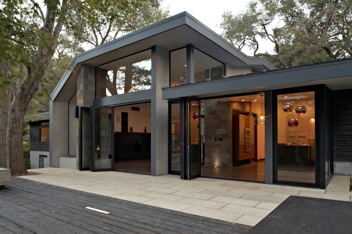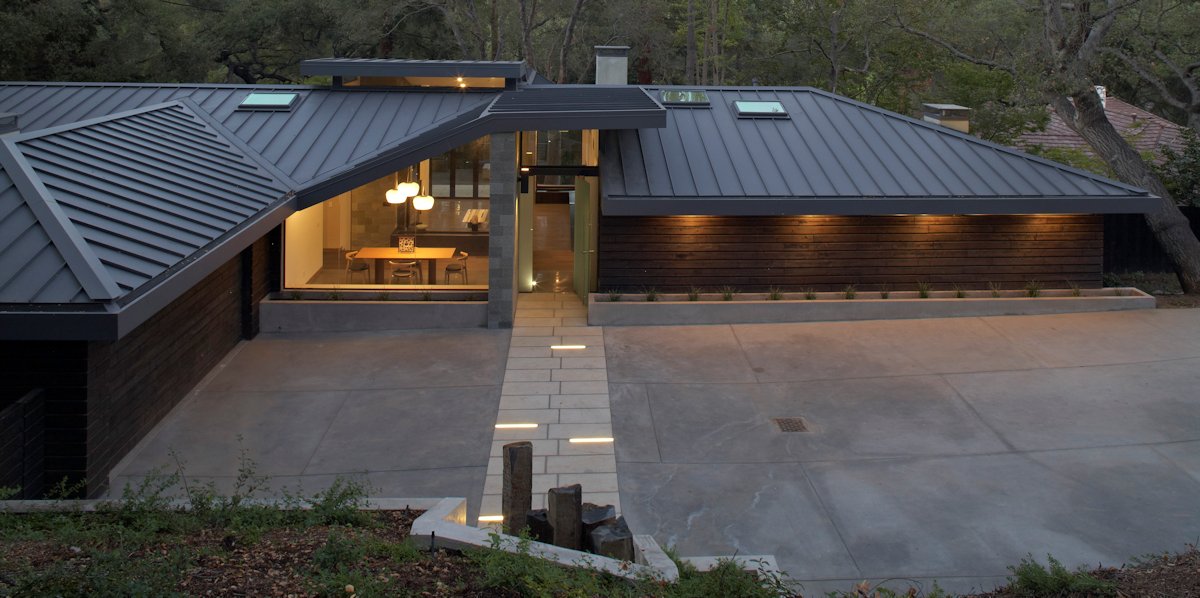 Barely perceptible from the street above, the Kim Residence, by form environment research (fer) studio, is designed to blend into the shadows of the La Canada foothills. Set on a slope below the road and shrouded in native oaks and redwoods, the house appears to float under the folding planes of its dark roof, which glows from beneath, through lit clearstories and concealed windows. This gray standing seam metal roof, a defining feature of this enigmatic home, provides textural contrast to the black stained cedar exterior siding and the softness of the surrounding landscape.Approaching the residence down the sloped drive, the black basalt columns of a water feature puncture the ground plane of the restrained front entry court. From there, a single path of interlocking pavers, inlaid at intervals with LED bricks, takes visitors straight through the front entrance. The spine of the home is organized along a primary north-south axis that is defined by a glazed open channel through the house that connects the basalt water feature and path at the south entrance and, in perfect alignment, the existing pool and a sprawling oak tree on it north end. Shared materials, angles and sight lines through the house, make the transition, from outside in, fluid.