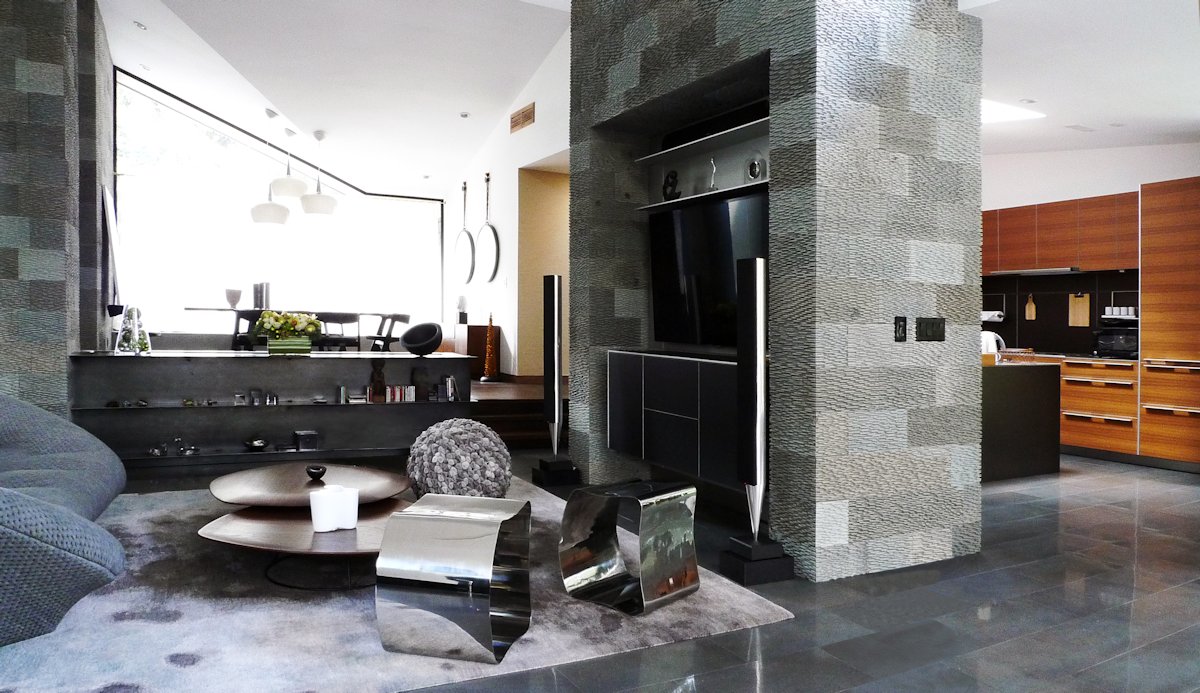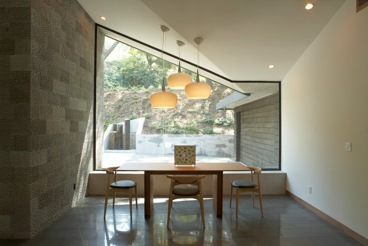 The common areas of the home are arranged along this primary north-south axis. Through the foyer, around the textured Lada stone wall, the first gathering space is the formal dining area. It’s defined by a dramatic downward fold in the ceiling that is continued through the adjoining window that overlooks the front arrival area and wooded property. Billowy pendant lights emphasize, through contrast, the acute angularity of the space and the austerity of the natural color palette, materials and furnishings, designed to show off the views outside.