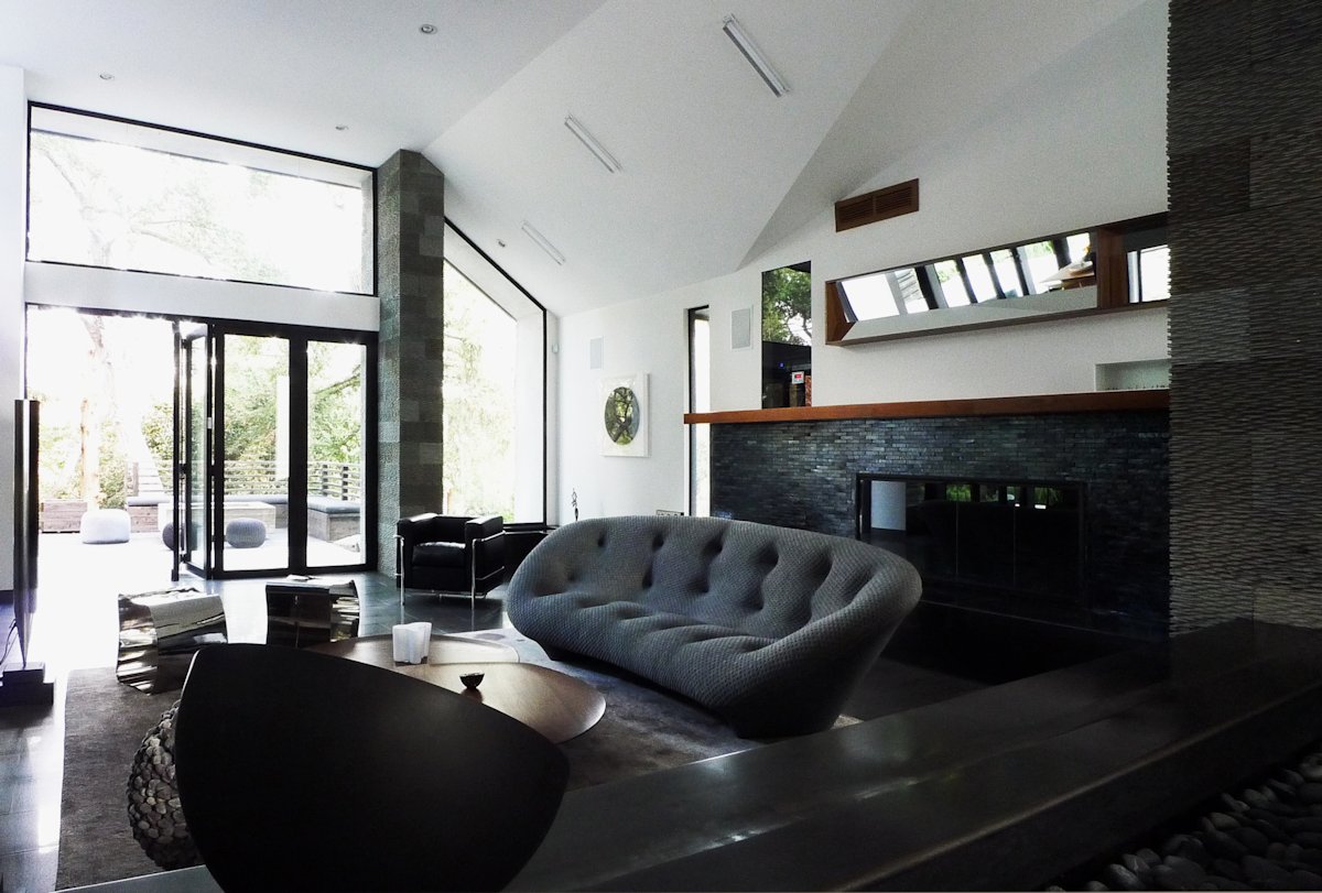 common areas and intimate tucked-away spaces within the context of the larger family room. A tiled gas fireplace integrates a steel bench that wraps around the room and ends underneath the picture window that frames the property’s defining oak tree, at the north end of the primary axis. Bi-fold glass doors open up to an expansive cedar patio enclosed in sequoias and overlooking the sunken rear garden and pool. A central unit that houses the living room television on one side and kitchen cabinetry on the other, implies a separation between the living room and eat-in kitchen.