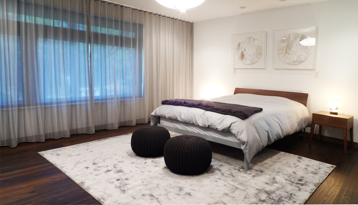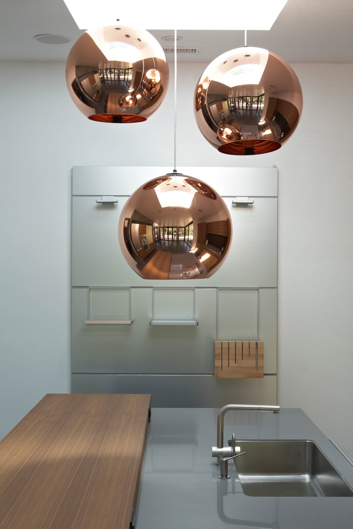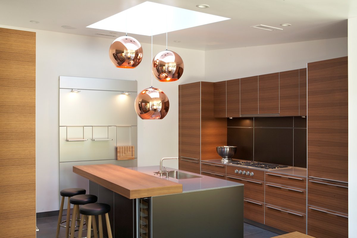 By comparison, the custom kitchen, by luxury brand Bulthaup, is one of the more enclosed areas of the residence but, like the rest of the interiors, it is strictly edited to wood, stone and steel. All appliances and accessories are concealed within the natural walnut veneer cabinetry to create a seamless contemporary space. A stainless steel wall unit and matching center island countertop gleam underneath an overhead skylight, from which globed copper colored pendant lamps descend and reflect natural light. Attached to the kitchen, a more casual eating area is encased in glass walls and doors, lending a sense of dining al fresco.