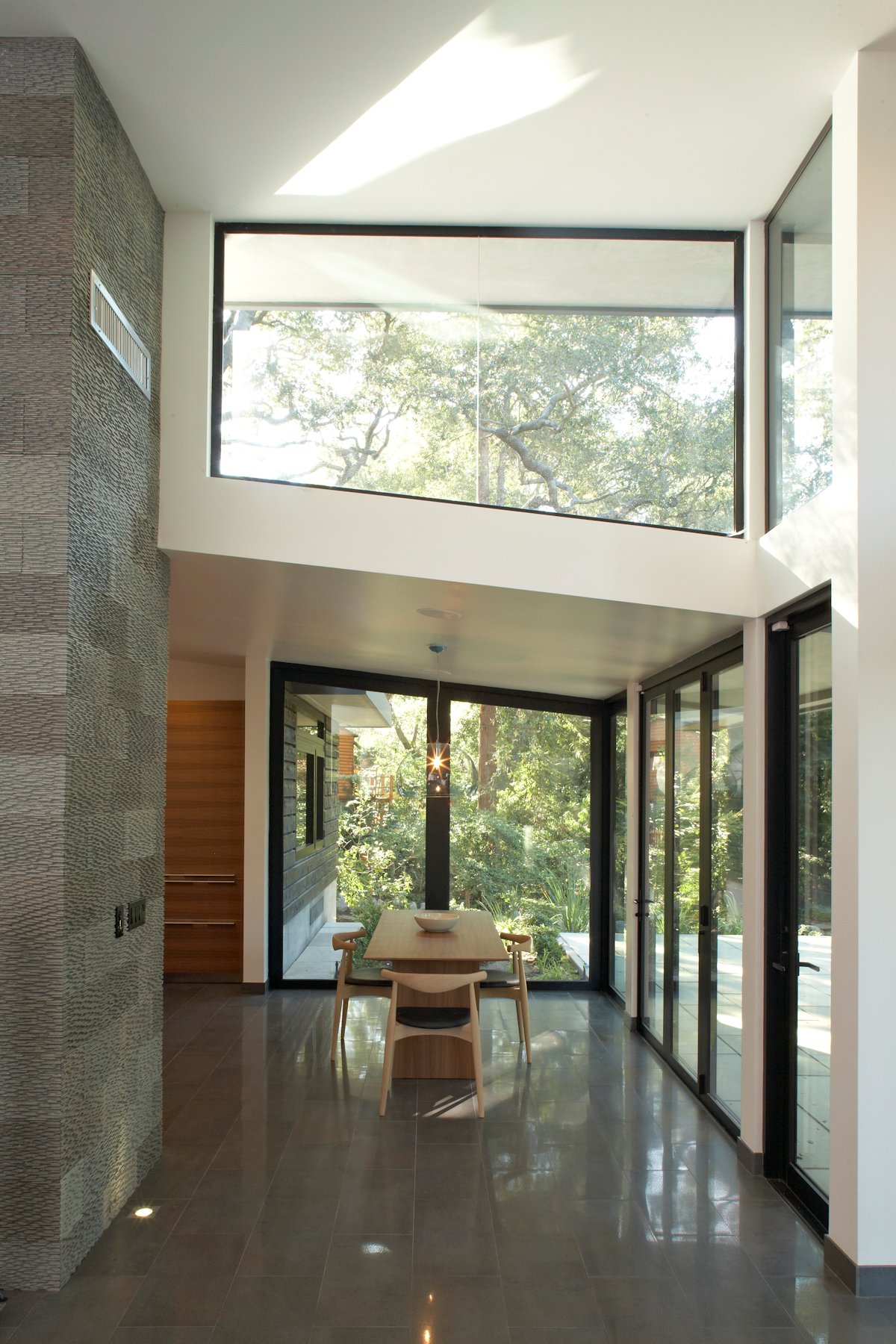 As with all (fer) studio projects, environmental sensitivity is part of the core design. From the outset, (fer) studio reoriented the home to take best advantage of the sun-shade patterns of the site, to provide natural heating, cooling and lighting of both interior and exteriors spaces. This includes siting the front entry court and back patio under a canopy of deciduous trees, to provide light and warmth in the winter months and cool shade in the warm La Canada summers; and the North-South axis of the glass clearstories and glazed walls maximize natural daylighting throughout the interior spaces, eliminating the need for artificial lighting during the day.The energy star rated standing seam metal roof and cool roof reflective paint keep the home at a lower temperature, reducing energy consumption for cooling by as much as 30% The exterior of the home and the garage door are clad in Western Red Cedar siding, a renewable resource that is harvested from sustainably managed forests. The back deck is also Western Red Cedar. All of the windows are low-E insulating argon-filled glass, which also reduces energy consumption by keeping the home cooler during the warm months and warmer in the cool seasons. A tankless water heater provides hot water on demand, countering the energy losses associated with storage water heaters. All interior paint is low-VOC, and recessed interior lighting is low-voltage.