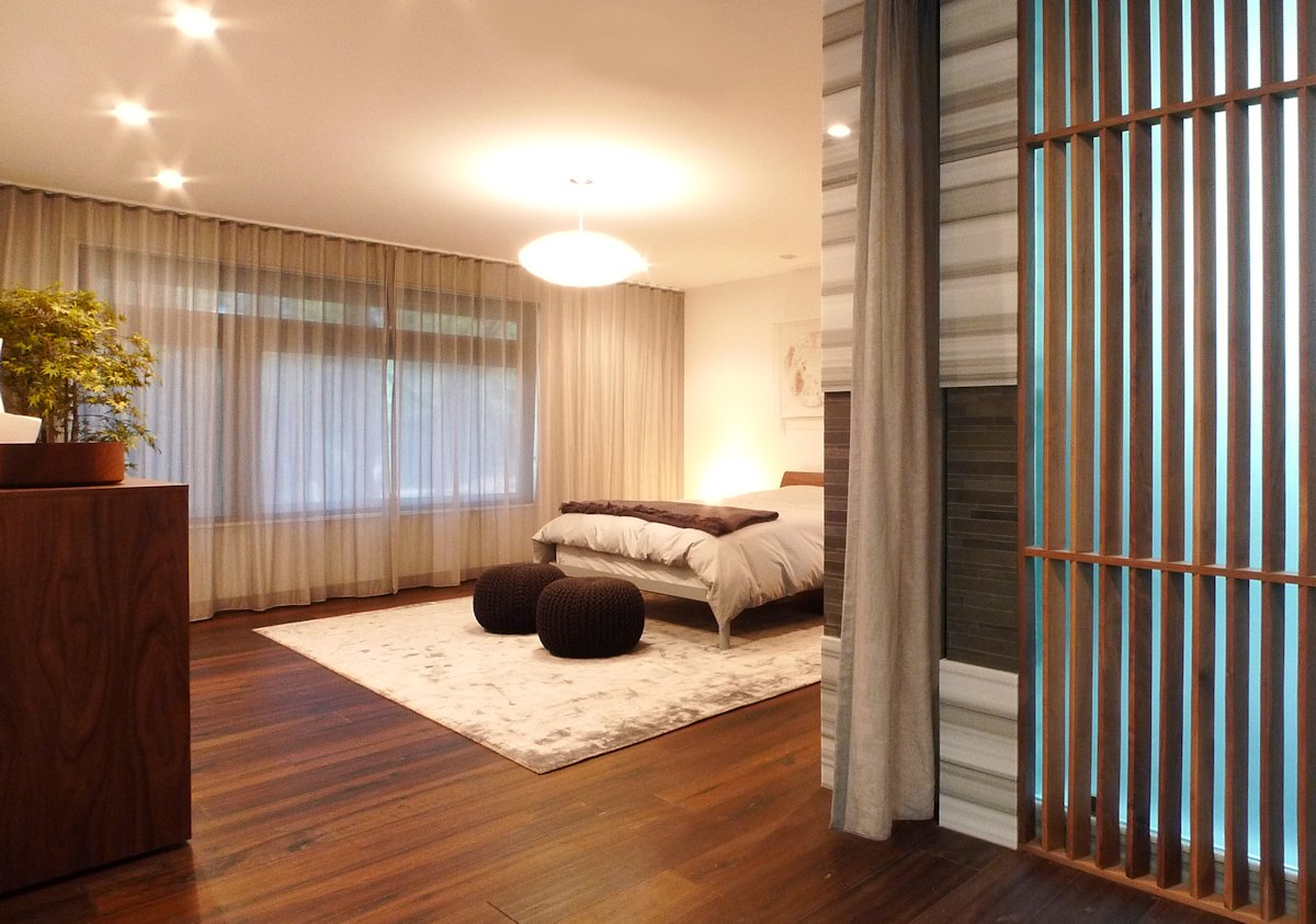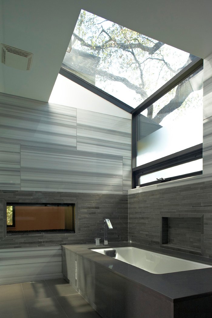 The private areas of the home are organized along the secondary east-west axis, increasing in intimacy to the east wing. The office, guest room, powder room and laundry, which connect to the garage, are grouped on the west end. The more private east wing includes a bedroom, bathroom and the master en suite. The master bedroom is anchored by a large dual-sided gas fireplace mounted into a striated marble wall that is shared by the master bathroom. An oversized stone tub sits on the opposite side of the fireplace under a wraparound window that offers views of the woods outside.