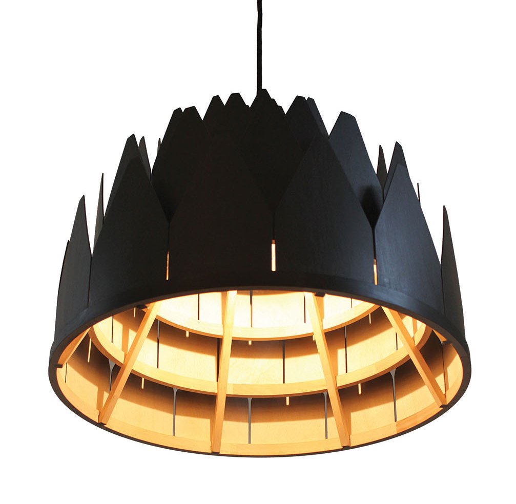 The evening is the time of day when light turns into dark, day into night and forms into silhouettes. It is also the time of day when the electric light truly comes to use. The lamp is coated black on the outside, but has kept its natural wooden color on the inside.