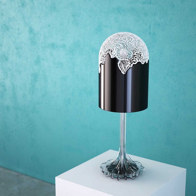 Lacelamps is our first lighting collection from our creative world. The collection includes a table lamp and a suspension, deep black lacquer and all two suited with imaginary laces, of a white translucent very subtle. Inspired by traditional lace and fully revisited through 3D printing. The luminous evening projections have been designed to offer a soothing and enveloping atmosphere at once. Their broadcasts impregnate the interior and creates a new dimension!