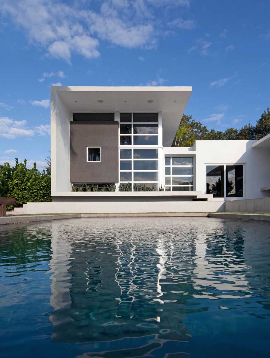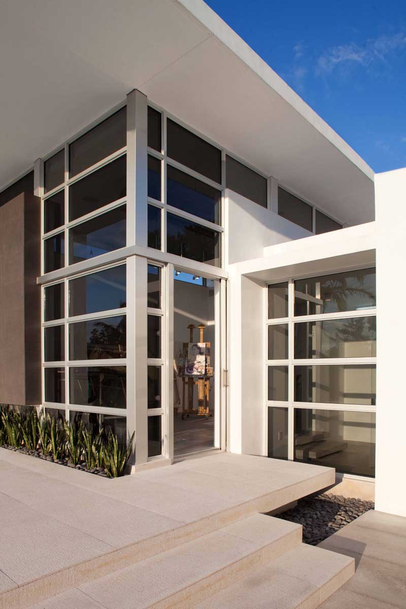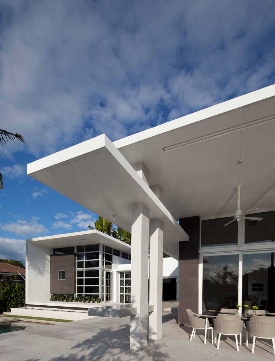 Despite the restrictions and limits on glazing/mullion ratios of the South Florida hurricane building code, the project aimed to connect the interior spaces to the outdoors in every possible way. This included large sliders, plantings at the edge of both, the studio and the covered terrace areas, as well as the linear canopies that thrust the entire setting towards the lake.