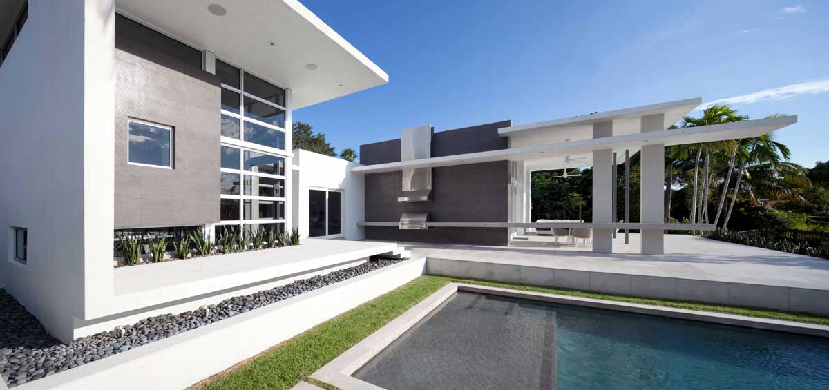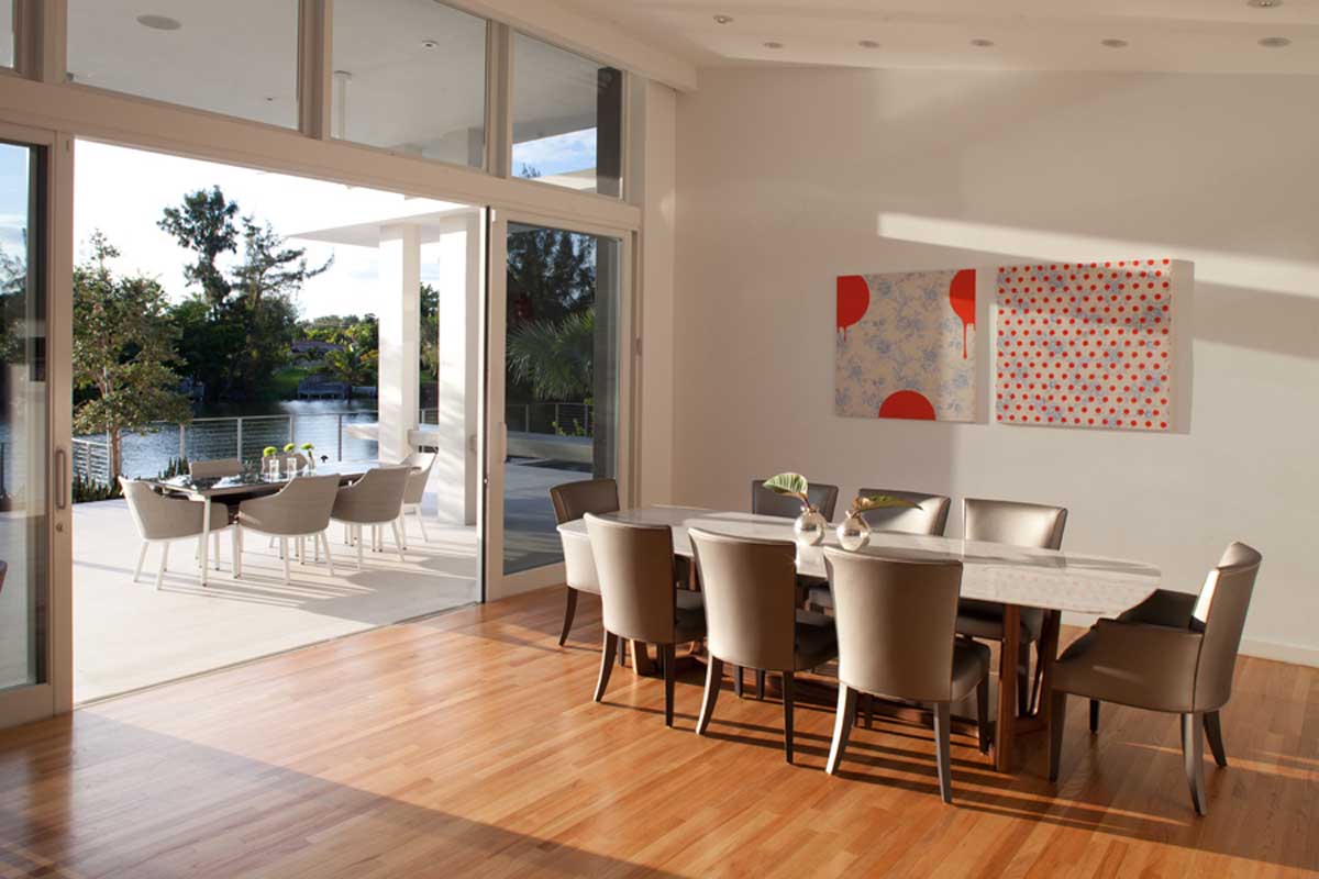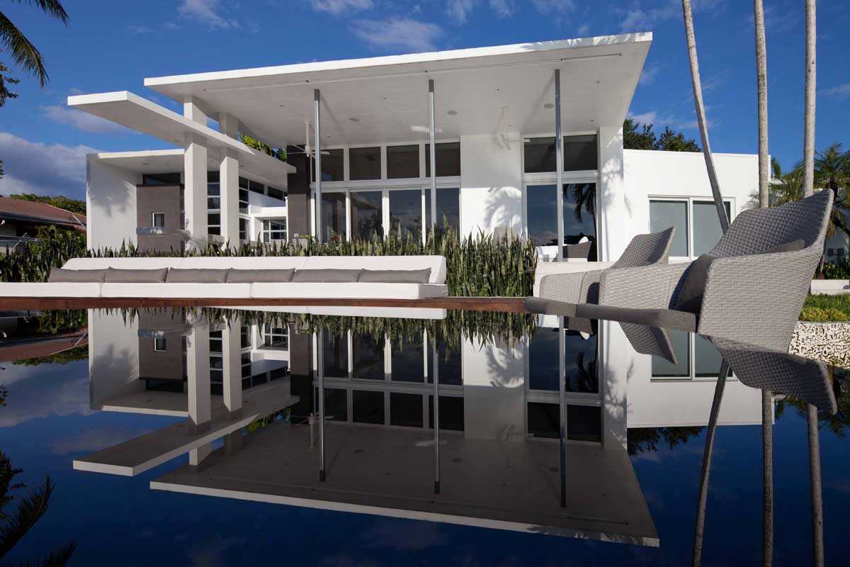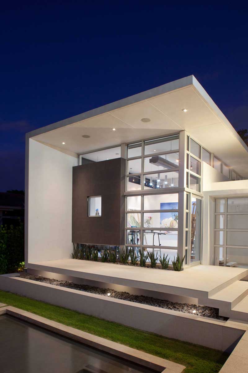 Despite the restrictions and limits on glazing/mullion ratios of the South Florida hurricane building code, the project aimed to connect the interior spaces to the outdoors in every possible way. This included large sliders, plantings at the edge of both, the studio and the covered terrace areas, as well as the linear canopies that thrust the entire setting towards the lake.