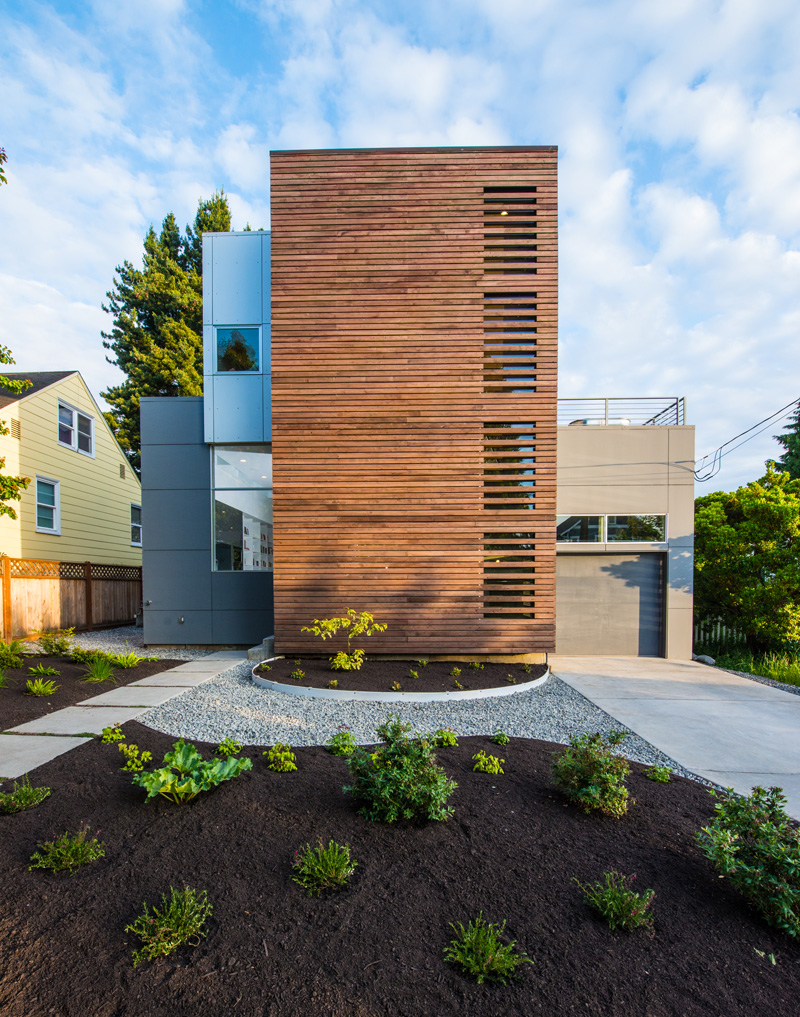 The rooftop deck replaces the displaced footprint of the home while garden planters utilize the rainwater.