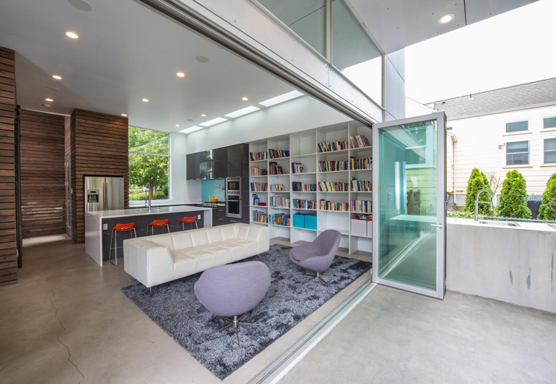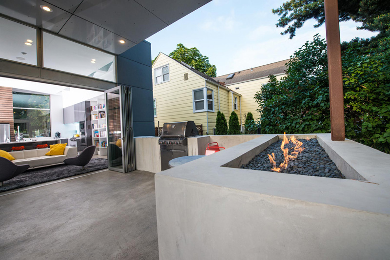 The small footprint allowed for less of a typical living space so the design incorporated a covered patio off of the living room. Separated only by a folding window wall, this doubled the interior space when opened. Keeping the smaller existing footprint also allowed for more yard play space for the kids and garden space for the entire family.