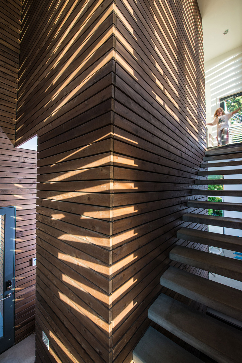 Connecting the living level with the bedrooms above is an open stairwell surrounded by glass. To avoid excessive sun exposure, the windows are clad with a cedar wall screen that allows filtered light and view in and out of the home.