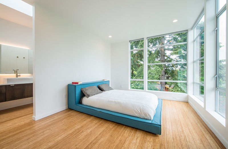 Floating above the concrete patio is the aluminum-clad form containing the main bedroom and bath. Skylights brighten the bathroom with natural light, while providing privacy from the neighboring homes.