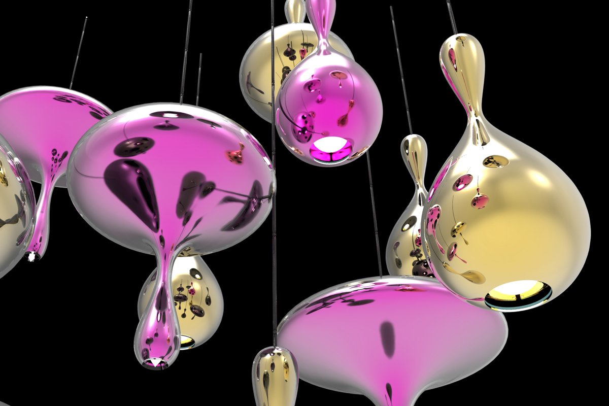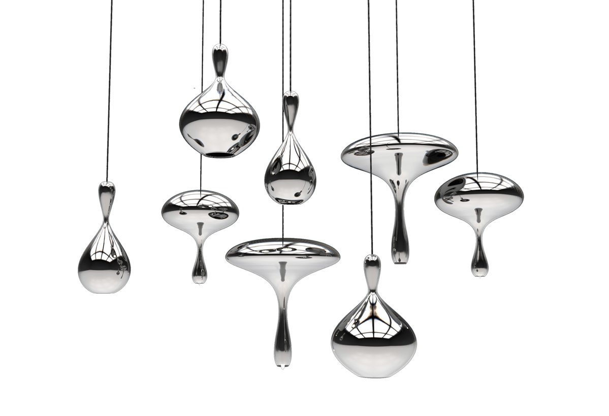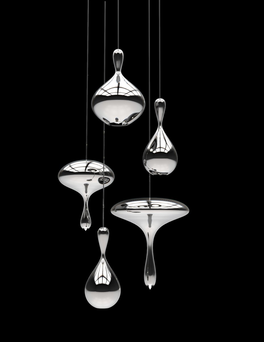 Frozen in space these lights capture the spirit of lava drops floating on liquid. Made of mirrored glass each drops works as a source of light as well as a reflector, multiplying the light and widening its range. When off or during the day, the light behaves as if were still on, as it reflects natural light through its sculptural body.