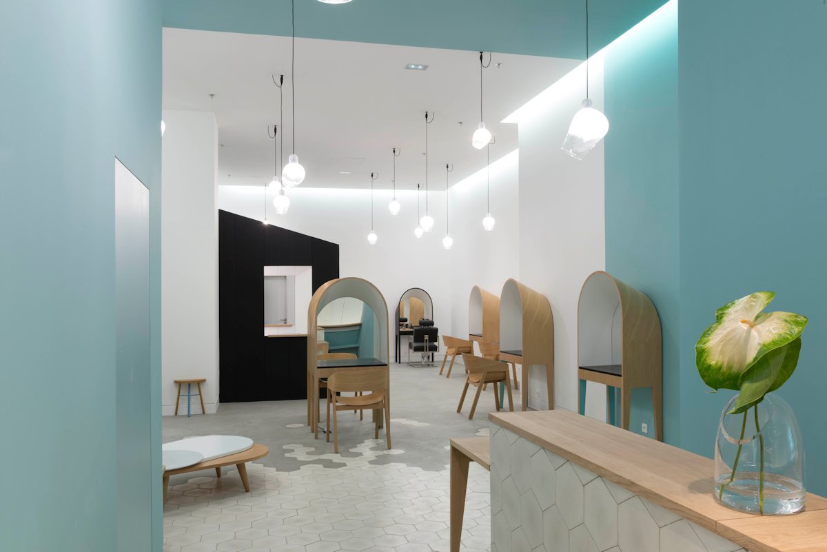 The creative thinking behind the salon is visible throughout its interior. From suspended glass pendant lights, blown in Italy and inspired by the shape of vintage hairdryers, to the simple sofa and coffee table that adorn the salon’s waiting area, there is an alluring tone to the modern space, which has been realised in the muted seaside tones of azure blue and yellow.