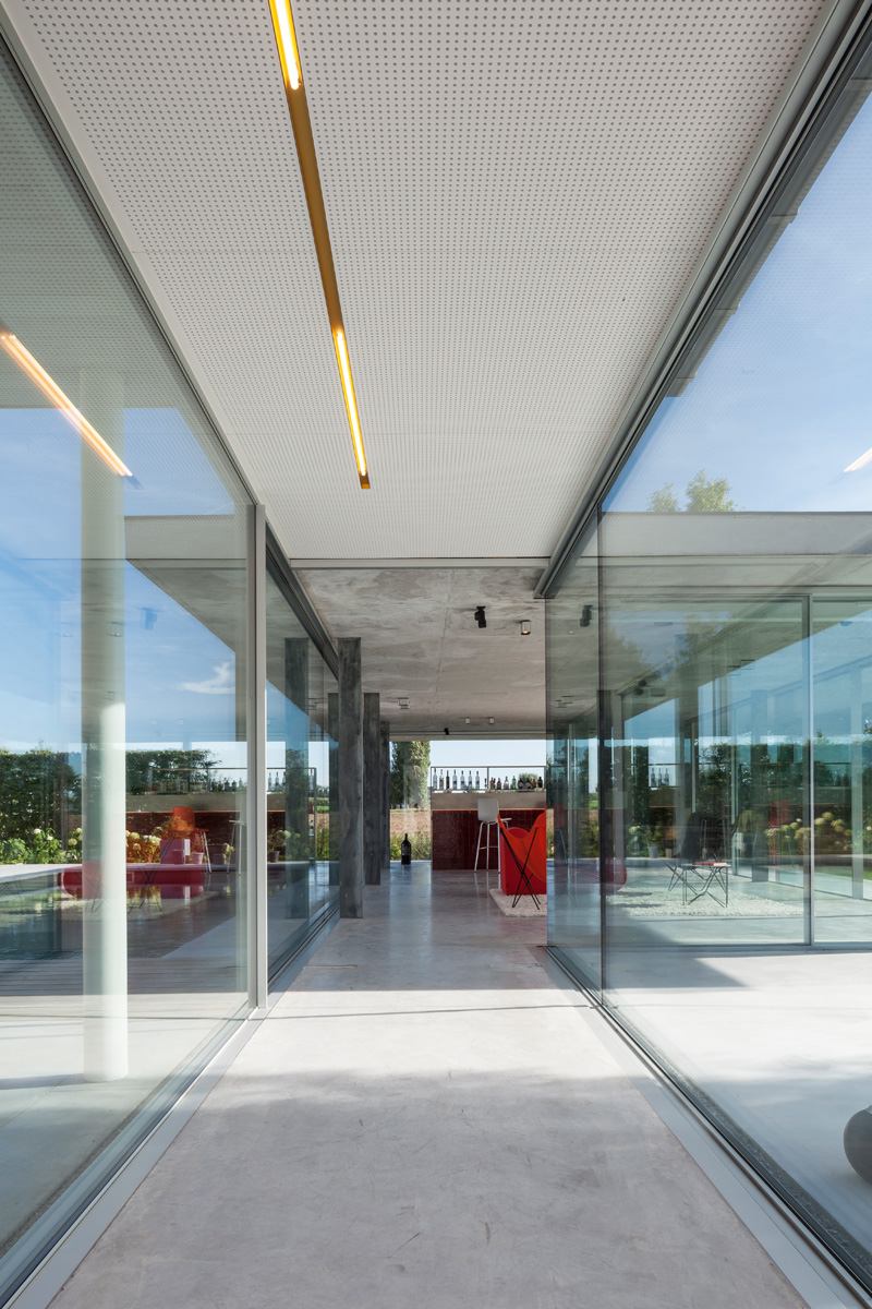 The pavilion, which was connected to the residence by using a glass gallery, is completely enveloped in glass. The roof, in exposed concrete, contrasts with the fragility of the glass. The roof was cast on site with the aid of sight formwork and it is supported by steel fins.