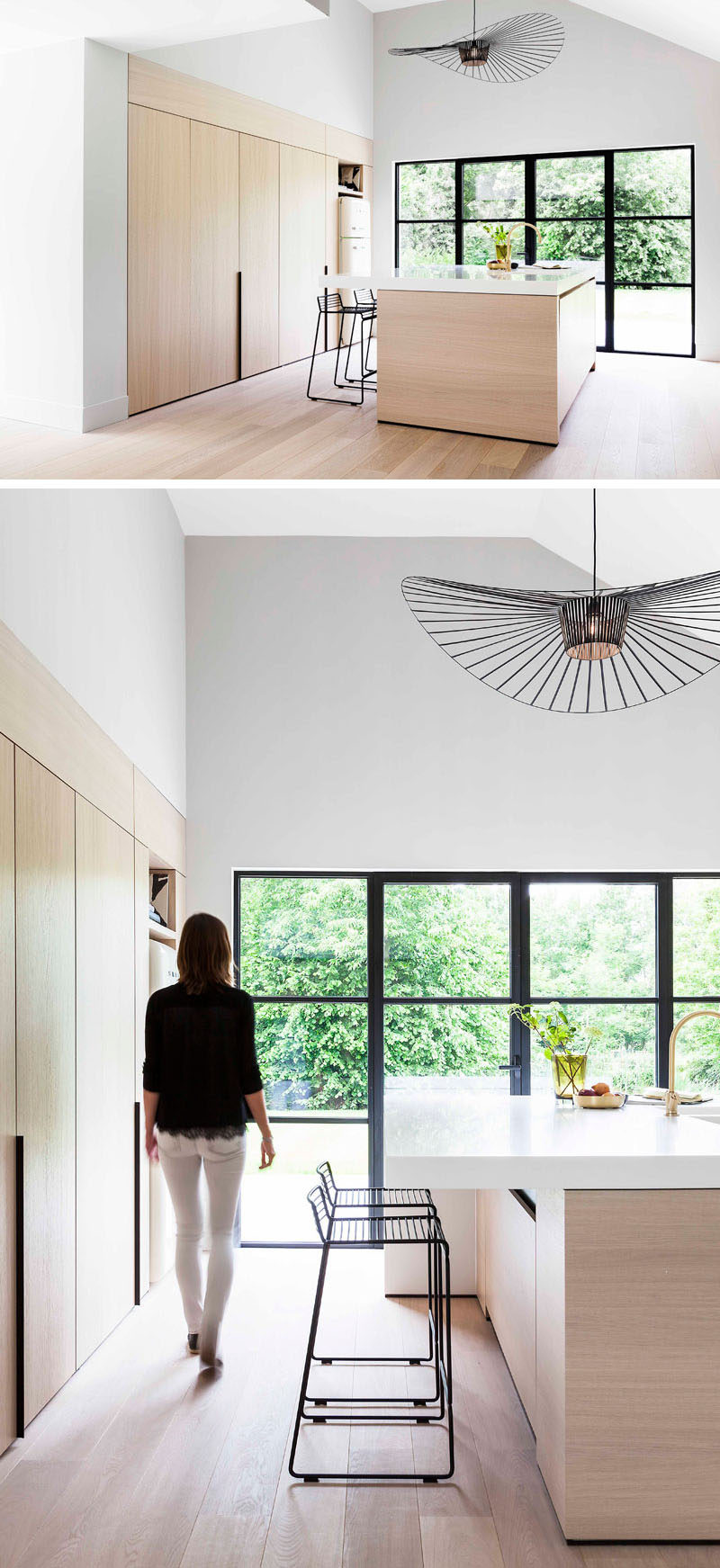 When redesigning this Dutch bungalow, originally built in the 1970’s, JUMA architects wanted to create a bright space full of natural light and views of the garden. One of the ways they did that was by creating a kitchen that features light wood, minimal hardware, and a large wall of black-framed windows and doors that open up to the garden.